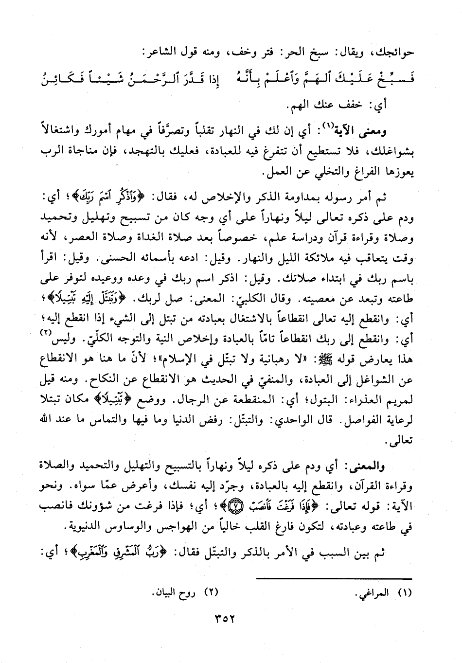 والمعنى: أي ودم على ذكره ليلًا ونهارًا بالتسبيح والتهليل والتحميد والصلاة وقراءة القرآن، وانقطع إليه بالعبادة، وجرّد إليه نفسك، وأعرض عمّا سواه. ونحو الآية: قوله تعالى: {فَإِذَا فَرَغْتَ فَانْصَبْ (7)}؛ أي: فإذا فرغت من شؤونك فانصب في طاعته وعبادته، لتكون فارغ القلب خاليًا من الهواجس والوساوس الدنيوية.
