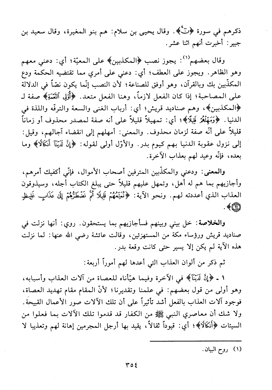 والمعنى: ودعني والمكذّبين المترفين أصحاب الأموال، فإنّي أكفيك أمرهم، وأجازيهم بما هم له أهل، وتمهل عليهم قليلًا حتى يبلغ الكتاب أجله، وسيذوقون العذاب الذي أعددته لهم. ونحو الآية: {نُمَتِّعُهُمْ قَلِيلًا ثُمَّ نَضْطَرُّهُمْ إِلَى عَذَابٍ غَلِيظٍ (24)}.
