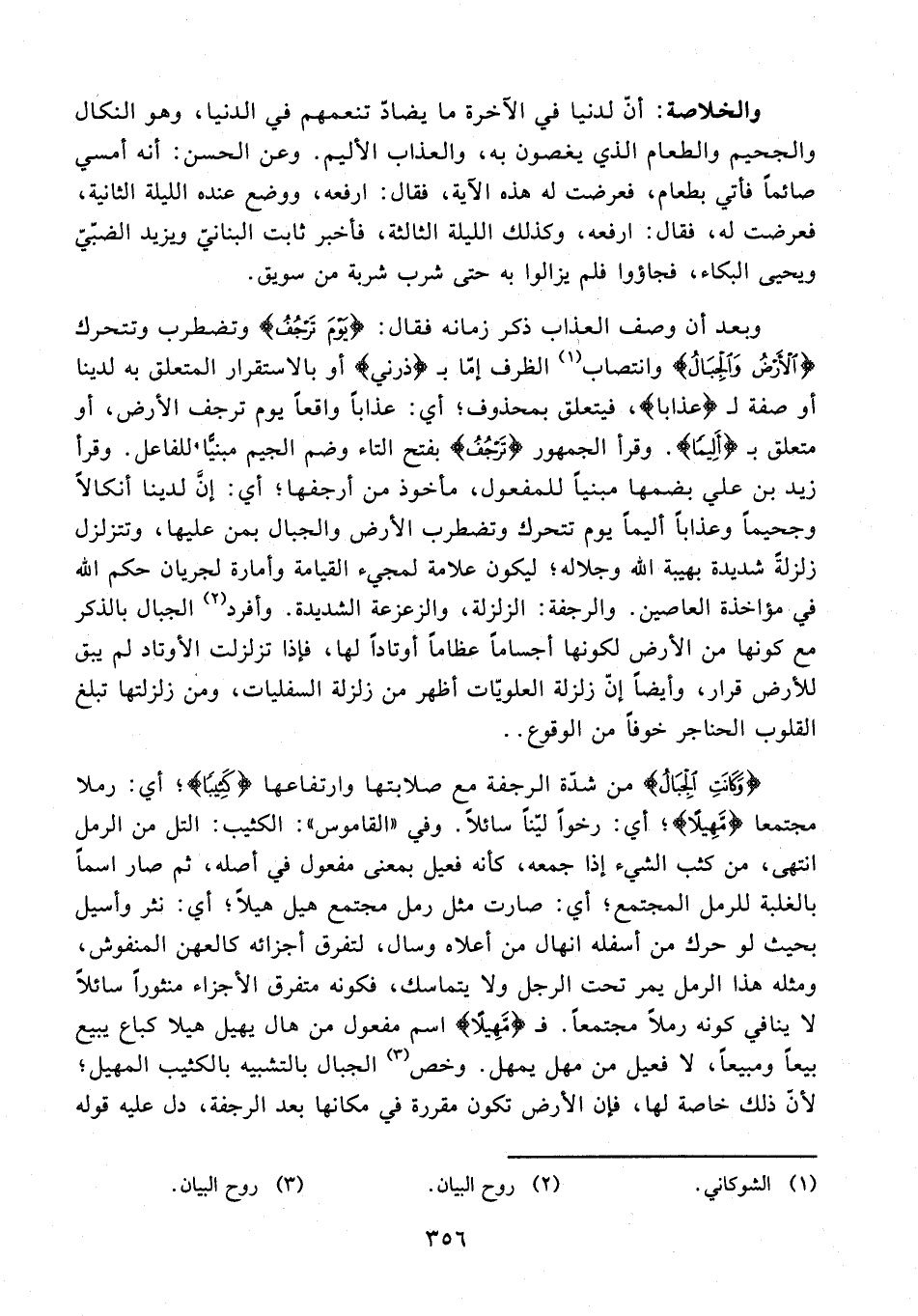 14 - وبعد أن وصف العذاب ذكر زمانه فقال: {يَوْمَ تَرْجُفُ} وتضطرب وتتحرك {الْأَرْضُ وَالْجِبَالُ} وانتصاب (¬1) الظرف إمّا بـ {ذرني} أو بالاستقرار المتعلق به لدينا أو صفة لـ {عذابا}، فيتعلق بمحذوف؛ أي: عذابًا واقعًا يوم ترجف الأرض، أو متعلق بـ {أَلِيمًا}. وقرأ الجمهور {أَلِيمًا} بفتح التاء وضم الجيم مبنيًّا للفاعل. وقرأ زيد بن علي بضمها مبنيًا للمفعول، مأخوذ من أرجفها، أي: إنَّ لدينا أنكالًا وجحيمًا وعذابًا أليمًا يوم تتحرك وتضطرب الأرض والجبال بمن عليها، وتتزلزل زلزلةً شديدة بهيبة الله وجلاله؛ ليكون علامة يخطيء القيامة وأمارة لجريان حكم الله في مؤاخذة العاصين. والرجفة: الزلزلة، والزعزعة الشديدة. وأفرد (¬2) الجبال بالذكر مع كونها من الأرض لكونها أجسامًا عظامًا أوتادًا لها، فإذا تزلزلت الأوتاد لم يبق للأرض قرار، وأيضًا إنّ زلزلة العلويّات أظهر من زلزلة السفليات، ومن زلزلتها تبلغ القلوب الحناجر خوفًا من الوقوع ..