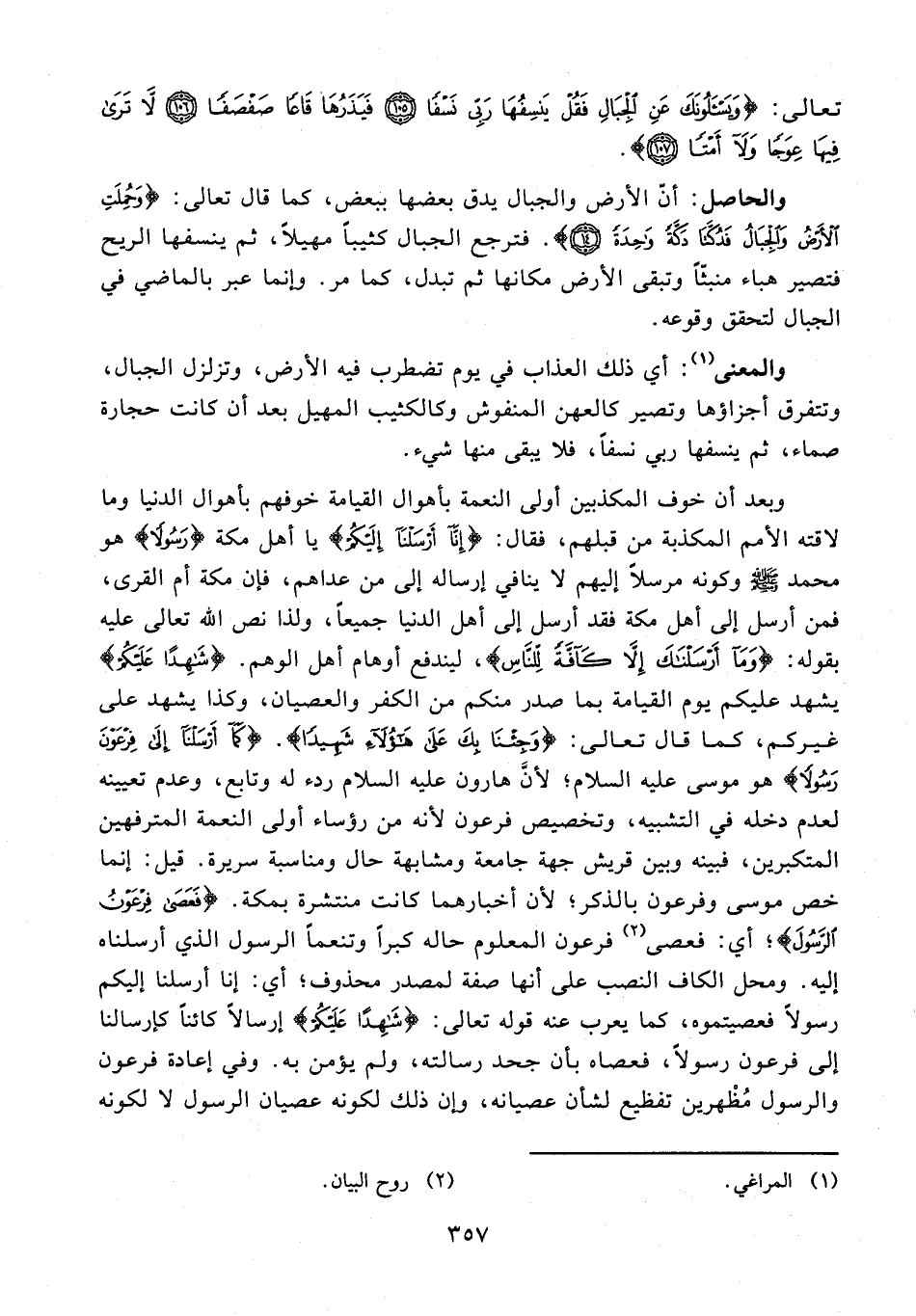 15 - وبعد أن خوف المكذبين أولى النعمة بأهوال القيامة خوفهم بأهوال الدنيا وما لاقته الأمم المكذبة من قبلهم، فقال: {إِنَّا أَرْسَلْنَا إِلَيْكُمْ} يا أهل مكة {رَسُولًا}، هو محمد - صلى الله عليه وسلم - وكونه مرسلًا إليهم لا ينافي إرساله إلى من عداهم، فإن مكة أم القرى، فمن أرسل إلى أهل مكة فقد أرِسل إلى أهل الدنيا جميعًا، ولذا نص الله تعالى عليه بقوله: {وَمَا أَرْسَلْنَاكَ إِلَّا كَافَّةً لِلنَّاسِ}، ليندفع أوهام أهل الوهم. {شَاهِدًا عَلَيْكُمْ} يشهد عليكم يوم القيامة بما صدر منكم من الكفر والعصيان، وكذا يشهد على غيركم، كما قال تعالى: {وَجِئْنَا بِكَ عَلَى هَؤُلَاءِ شَهِيدًا}. {كَمَا أَرْسَلْنَا إِلَى فِرْعَوْنَ رَسُولًا} هو موسى عليه السلام؛ لأنَّ هارون عليه السلام ردء له وتابع، وعدم تعيينه لعدم دخله في التشبيه، وتخصيص فرعون لأنه من رؤساء أولى النعمة المترفهين المتكبرين، فبينه وبين قريش جهة جامعة ومشابهة حال ومناسبة سريرة. قيل: إنما خص موسى وفرعون بالذكر؛ لأن أخبارهما كانت منتشرة بمكة.