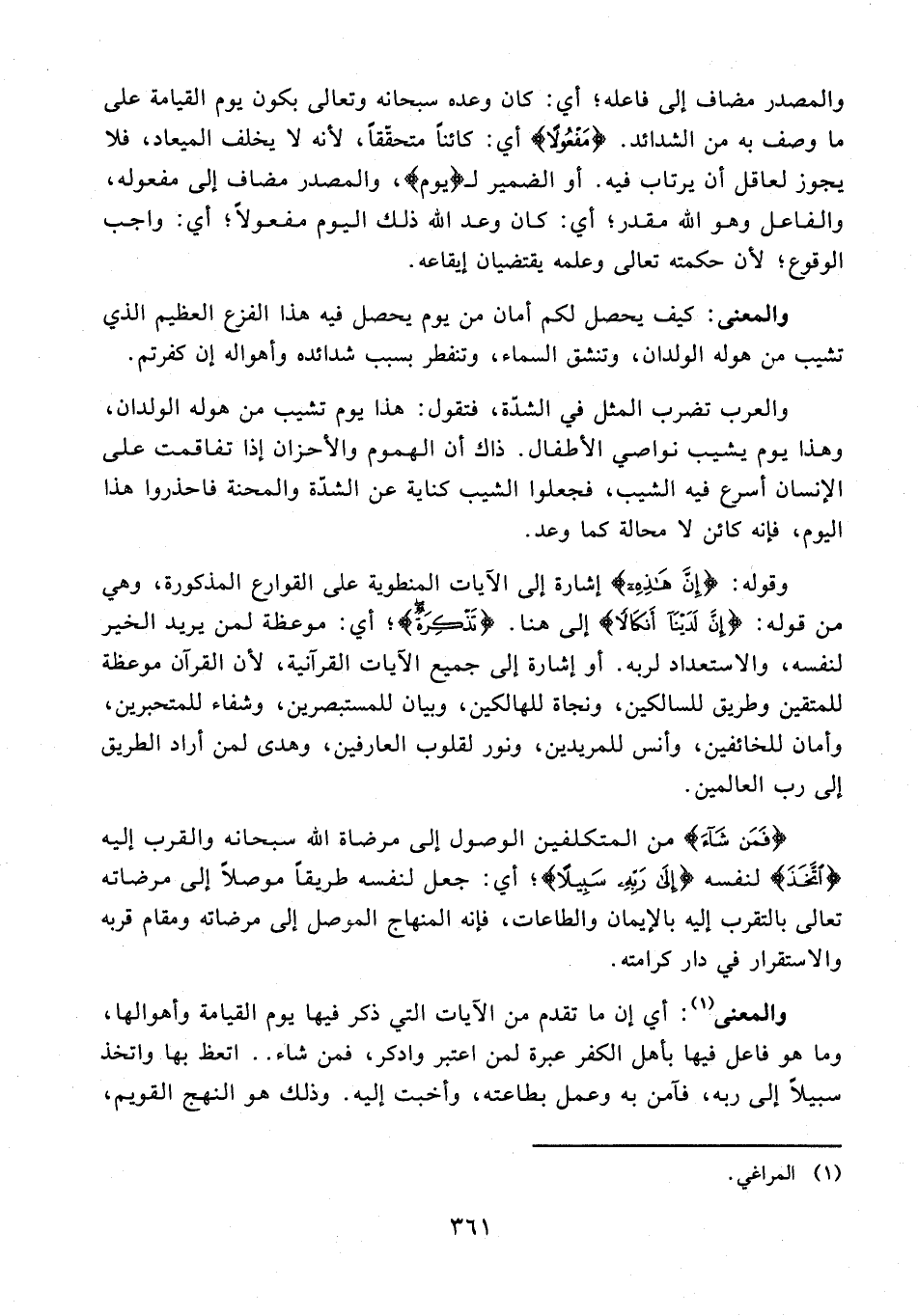 والمصدر مضاف إلى فاعله؛ أي: كان وعده سبحانه وتعالى يكون يوم القيامة على ما وصف به من الشدائد. {مَفْعُولًا} أي: كائنًا متحقّقًا؛ لأنه لا يخلف الميعاد، فلا يجوز لعاقل أن يرتاب فيه. أو الضمير لـ {يوم}، والمصدر مضاف إلى مفعوله، والفاعل وهو الله مقدر؛ أي: كان وعد الله ذلك اليوم مفعولًا؛ أي: واجب الوقوع؛ لأن حكمته تعالى وعلمه يقتضيان إيقاعه.