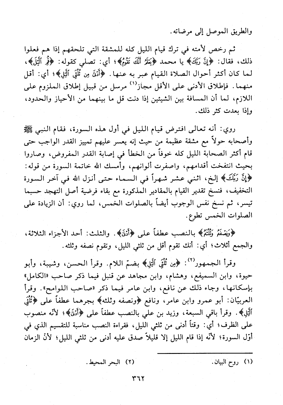 20 - ثم رخص لأمته في ترك قيام الليل كله للمشقة التي تلحقهم إذا هم فعلوا ذلك، فقال: {إِنَّ رَبَّكَ} يا محمد {يَعْلَمُ أَنَّكَ تَقُومُ}؛ أي: تصلي كقوله: {قُمِ اللَّيْلَ}، لما كان أكثر أحوال الصلاة القيام عبر به عنها. {أَدْنَى مِنْ ثُلُثَيِ اللَّيْلِ}؛ أي: أقل منهما. فإطلاق الأدنى على الأقل مجاز (¬1) مرسل من قبيل إطلاق الملزوم على اللازم، لما أن المسافة بين الشيئين إذا دنت قل ما بينهما من الأحياز والحدود، وإذا بعدت كثر ذلك.