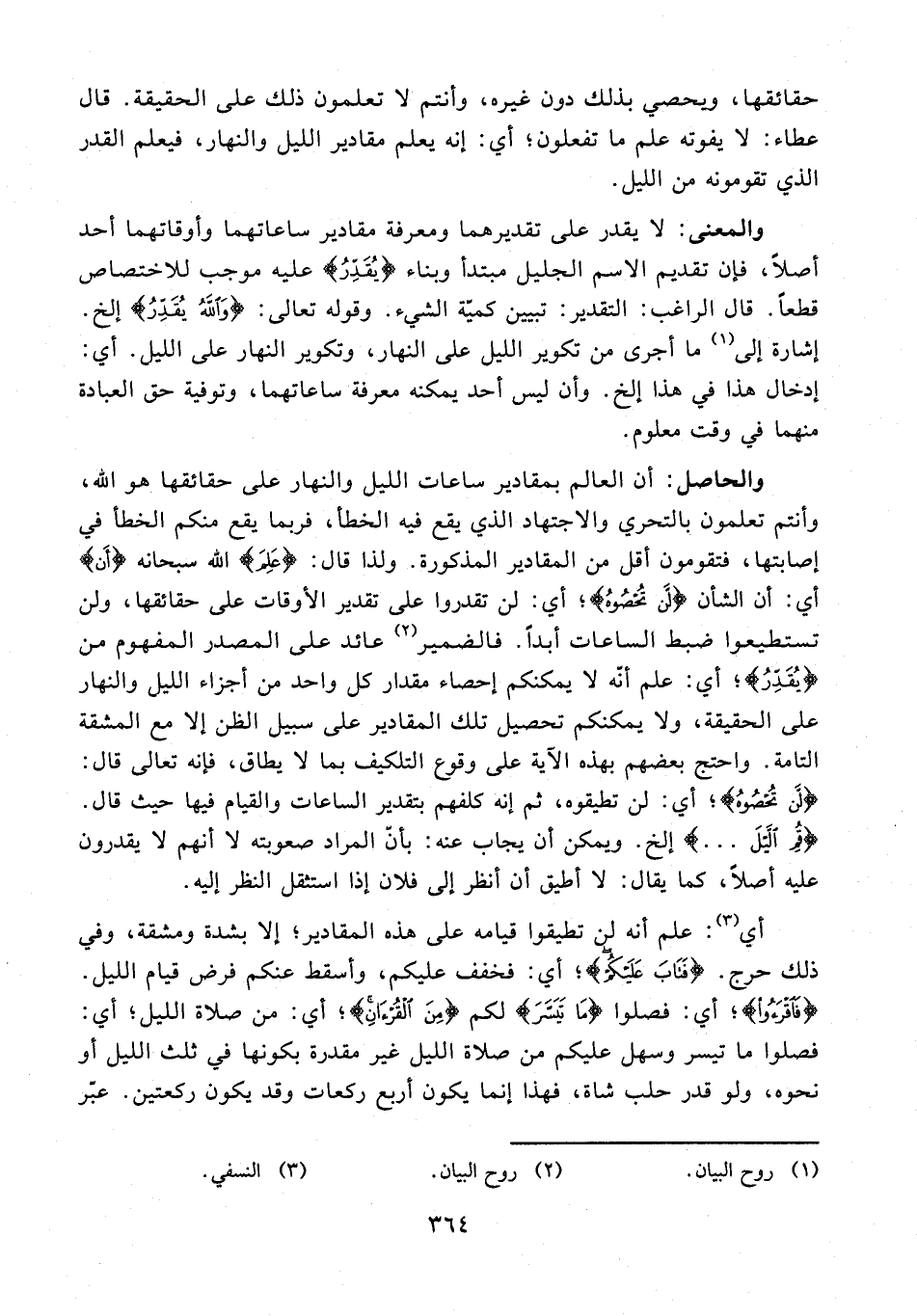 والحاصل: أن العالم بمقادير ساعات الليل والنهار على حقائقها هو الله، وأنثم تعلمون بالتحري والاجتهاد الذي يقع فيه الخطأ، فربما يقع منكم الخطأ في إصابتها، فتقومون أقل من المقادير المذكورة. ولذا قال: {عَلِمَ} الله سبحانه {أَنْ} أي: أن الشأن {لَنْ تُحْصُوهُ}؛ أي: لن تقدروا على تقدير الأوقات على حقائقها، ولن تستطيعوا ضبط الساعات أبدًا. فالضمير (¬2) عائد على المصدر المفهوم من {يُقَدِّرُ}؛ أي: علم أنّه لا يمكنكم إحصاء مقدار كل واحد من أجزاء الليل والنهار على الحقيقة، ولا يمكنكم تحصيل تلك المقادير على سبيل الظن إلا مع المشقة التامة. واحتج بعضهم بهذه الآية على وقوع التلكيف بما لا يطاق، فإنه تعالى قال: {لَنْ تُحْصُوهُ}؛ أي: لن تطيقوه، ثم إنه كلفهم بتقدير الساعات والقيام فيها حيث قال. {قُمِ اللَّيْلَ ...} إلخ. ويمكن أن يجاب عنه: بأنّ المراد صعوبته لا أنهم لا يقدرون عليه أصلًا، كما يقال: لا أطيق أن أنظر إلى فلان إذا استثقل النظر إليه.