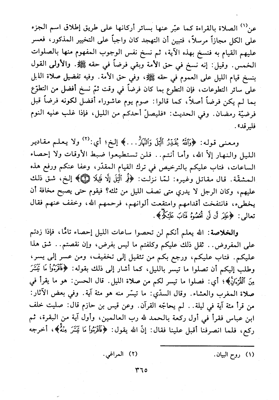 عن (¬1) الصلاة بالقراءة كما عبّر عنها بسائر أركانها على طريق إطلاق اسم الجزء على الكل مجازًا مرسلًا، فتبين أن التهجد كان واجبًا على التخيير المذكور، فعسر عليهم القيام به فنسخ بهذه الآية، ثم نسخ نفس الوجوب المفهوم منها بالصلوات الخمس. وقيل: إنه نسخ في حق الأمة وبقي فرضًا في حقه - صلى الله عليه وسلم -. والأولى القول بنسخ قيام الليل على العموم في حقه - صلى الله عليه وسلم -، وفي حق الأمة. وفيه تفضيل صلاة الليل على سائر التطوعات، فإن التطوع بما كان فرضًا في وقت ثمّ نسخ أفضل من التطوّع بما لم يكن فرضًا أصلًا، كما قالوا: صوم يوم عاشوراء أفضل لكونه فرضًا قبل فرضيّة رمضان. وفي الحديث: "فليصلّ أحدكم من الليل، فإذا غلب عليه النوم فليرقد".