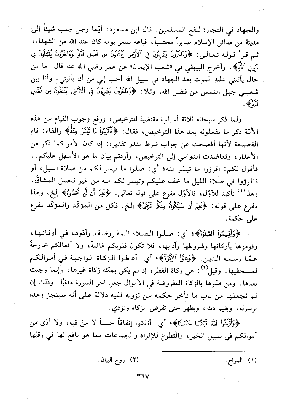 والجهاد في التجارة لنفع المسلمين. قال ابن مسعود: أيّما رجل جلب شيئًا إلى مدينة من مدائن الإسلام صابرًا محتسبًا، فباعه بسعر يومه كان عند الله من الشهداء، ثم قرأ قوله تعالى: {وَآخَرُونَ يَضْرِبُونَ فِي الْأَرْضِ يَبْتَغُونَ مِنْ فَضْلِ اللَّهِ وَآخَرُونَ يُقَاتِلُونَ فِي سَبِيلِ اللَّهِ}. وأخرج البيهقي في "شعب الإيمان" عن عمر رضي الله عنه قال: ما من حال يأتيني عليه الموت بعد الجهاد في سبيل الله أحب إلى من أن يأتيني، وأنا بين شعبتي جبل ألتمس من فضل الله، وتلا: {وَآخَرُونَ يَضْرِبُونَ فِي الْأَرْضِ يَبْتَغُونَ مِنْ فَضْلِ اللَّهِ}.