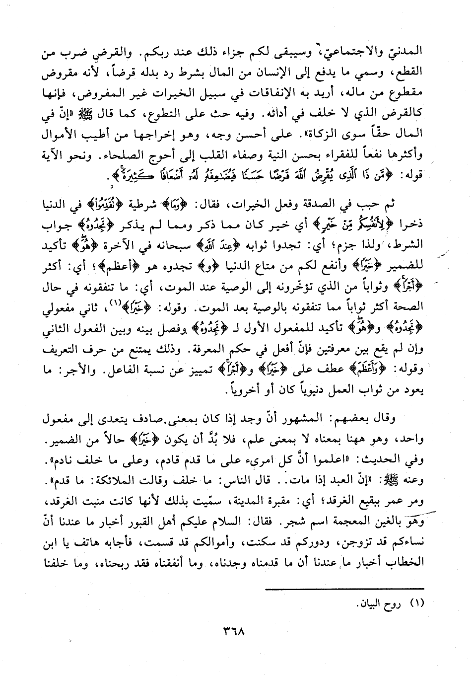 وقال بعضهم: المشهور أنّ وجد إذا كان بمعنى. صادف يتعدى إلى مفعول واحد، وهو هاهنا بمعناه لا بمعنى علم، فلا بُدَّ أن يكون {خَيْرًا} حالًا من الضمير. وفي الحديث: "اعلموا أنَّ كل امرىء على ما قدم قادم، وعلى ما خلف نادم". وعنه - صلى الله عليه وسلم -: "إنّ العبد إذا مات .. قال الناس: ما خلف وقالت الملائكة: ما قدم". ومر عمر ببقيع الغرقد؛ أي: مقبرة المدينة، سمّيت بذلك لأنها كانت منبت الغرقد، وهو بالغين المعجمة اسم شجر. فقال: السلام عليكم أهل القبور أخبار ما عندنا أن نساءكم قد تزوجن، ودوركم قد سكنت، وأموالكم قد قسمت، فأجابه هاتف يا ابن الخطاب أخبار ماء عندنا أن ما قدمناه وجدناه، وما أنفقناه فقد ربحناه، وما خلفنا