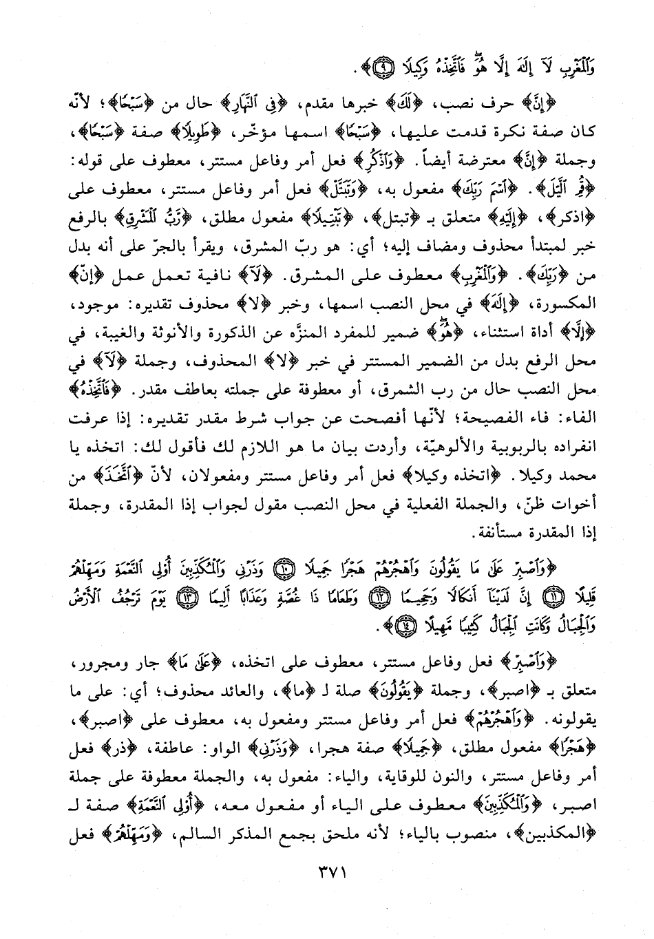 {إِنَّ} حرف نصب، {لَكَ} خبرها مقدم، {فِي النَّهَارِ} حال من {سَبْحًا}؛ لأنه كان صفة نكرة قدمت عليها، {سَبْحًا} اسمها مؤخّر، {طَوِيلًا} صفة {سَبْحًا}، وجملة {إِنَّ} معترضة أيضًا. {وَاذْكُرِ} فعل أمر وفاعل مستتر، معطوف على قوله: {قُمِ اللَّيْلَ}. {اسْمَ رَبِّكَ} مفعول به، {وَتَبَتَّلْ} فعل أمر وفاعل مستتر، معطوف على {اذْكُر}، {إِلَيْهِ} متعلق بـ {تبتل}، {تَبْتِيلًا} مفعول مطلق، {رَبُّ الْمَشْرِقِ} بالرفع خبر لمبتدأ محذوف ومضاف إليه؛ أي: هو ربّ المشرق، ويقرأ بالجرّ على أنه بدل من {رَبِّكَ}. {وَالْمَغْرِبِ} معطوف على المشرق. {لَا} نافية تعمل عمل {إنّ} المكسورة، {إِلَهَ} في محل النصب اسمها، وخبر {لا} محذوف تقديره: موجود، {إِلَّا} أداة استثناء، {هُوَ} ضمير للمفرد المنزَّه عن الذكورة والأنوثة والغيبة، في محل الرفع بدل من الضمير المستتر في خبر {لا} المحذوف، وجملة {لَا} في محل النصب حال من رب المشرق، أو معطوفة على جملته بعاطف مقدر. {فَاتَّخِذْهُ} الفاء: فاء الفصيحة؛ لأنّها أفصحت عن جواب شرط مقدر تقديره: إذا عرفت انفراده بالربوبية والألوهية، وأردت بيان ما هو اللازم لك فأقول لك: اتخذه يا محمد وكيلا. {اتخذه وكيلا} فعل أمر وفاعل مستتر ومفعولان؛ لأنّ {اتَّخَذَ} من أخوات ظنّ، والجملة الفعلية في محل النصب مقول لجواب إذا المقدرة، وجملة إذا المقدرة مستأنفة.