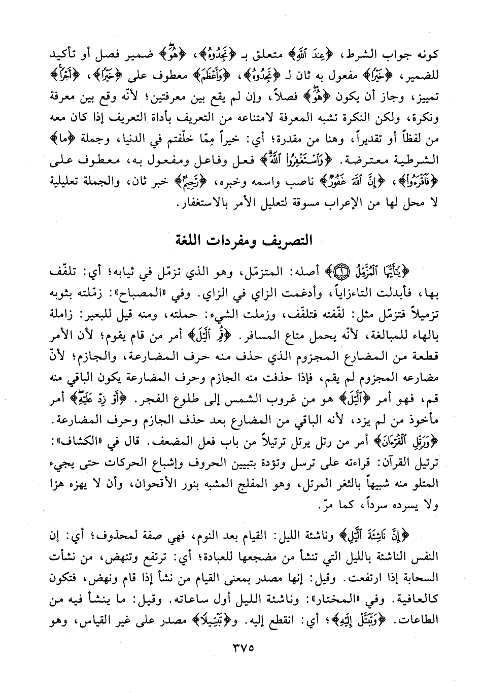{يَا أَيُّهَا الْمُزَّمِّلُ (1)} أصله: المتزمّل، وهو الذي تزمّل في ثيابه؛ أي: تلفّف بها، فأبدلت التاء زايًا، وأدغمت الزاي في الزاي. وفي "المصباح": زمّلته بثوبه تزميلًا فتزمّل مثل: لفّفته فتلفّف، وزملت الشيء: حملته، ومنه قيل للبعير: زاملة بالهاء للمبالغة، لأنّه يحمل متاع المسافر. {قُمِ اللَّيْلَ} أمر من قام يقوم؛ لأن الأمر قطعة من المضارع المجزوم الذي حذف منه حرف المضارعة، والجازم؛ لأن مضارعه المجزوم لم يقم، فإذا حذفت منه الجازم وحرف المضارعة يكون الباقي منه قم، فهو أمر {اللَّيْلَ} هو من غروب الشمس إلى طلوع الفجر. {أَوْ زِدْ عَلَيْهِ} أمر مأخوذ من لم يزد، لأنه الباقي من المضارع بعد حذف الجازم وحرف المضارعة. {وَرَتِّلِ الْقُرْآنَ} أمر من رتل يرتل ترتيلًا من باب فعل المضعف. قال في "الكشاف": ترتيل القرآن: قراءته على ترسل وتؤدة بتبيين الحروف وإشباع الحركات حتى يجيء المتلو منه شبيهًا بالثغر المرتل، وهو المفلج المشبه بنور الأقحوان، وأن لا يهزه هزا ولا يسرده سردًا، كما مرّ.