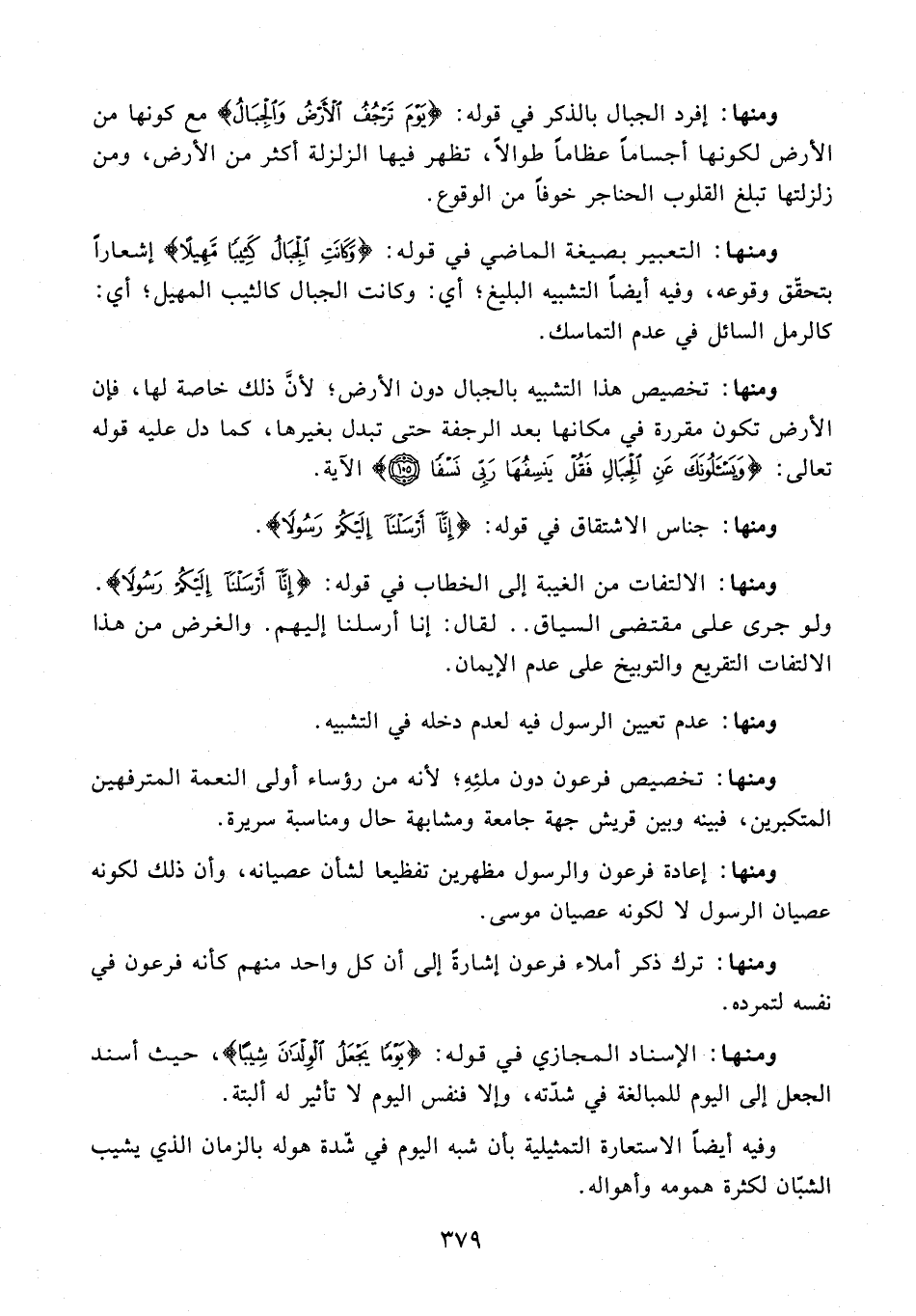 ومنها: تخصيص هذا التشبيه بالجبال دون الأرض؛ لأنَّ ذلك خاصة لها، فإن الأرض تكون مقررة في مكانها بعد الرجفة حتى تبدل بغيرها، كما دل عليه قوله تعالى: {وَيَسْأَلُونَكَ عَنِ الْجِبَالِ فَقُلْ يَنْسِفُهَا رَبِّي نَسْفًا (105)} الآية.