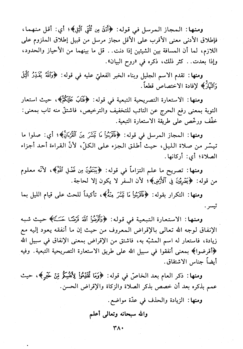ومنها: المجاز المرسل في قوله: {فَاقْرَءُوا مَا تَيَسَّرَ مِنَ الْقُرْآنِ}؛ أي: صلوا ما تيسّر من صلاة الليل، حيث أطلق الجزء على الكلّ، لأن القراءة أحد أجزاء الصلاة؛ أي: أركانها.