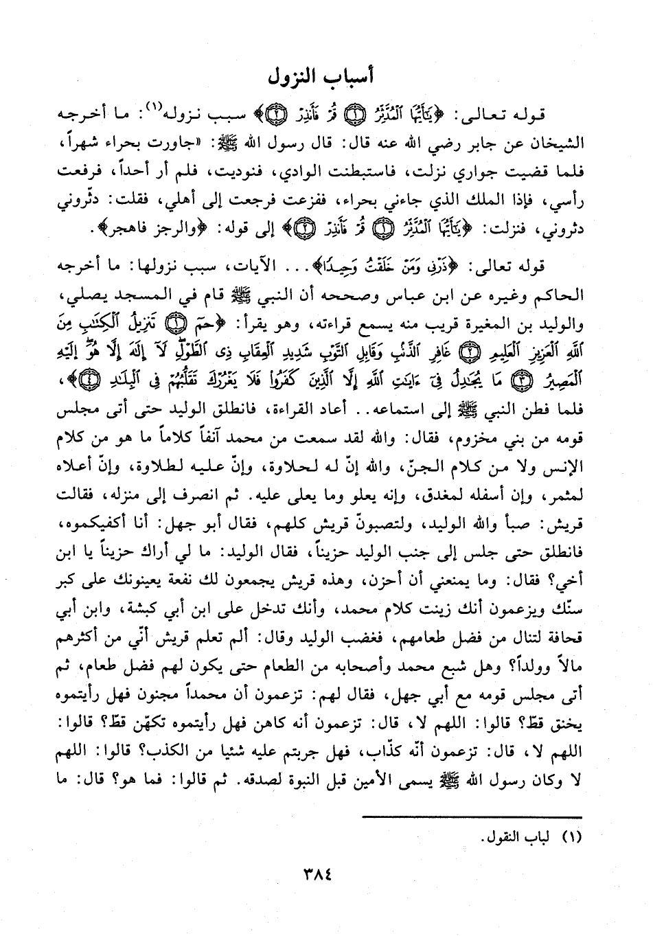 قوله تعالى: {ذَرْنِي وَمَنْ خَلَقْتُ وَحِيدًا} ... الآيات، سبب نزولها: ما أخرجه الحاكم وغيره عن ابن عباس وصححه أن النبي - صلى الله عليه وسلم - قام في المسجد يصلي، والوليد بن المغيرة قريب منه يسمع قراءته، وهو يقرأ: {حم (1) تَنْزِيلُ الْكِتَابِ مِنَ اللَّهِ الْعَزِيزِ الْعَلِيمِ (2) غَافِرِ الذَّنْبِ وَقَابِلِ التَّوْبِ شَدِيدِ الْعِقَابِ ذِي الطَّوْلِ لَا إِلَهَ إِلَّا هُوَ إِلَيْهِ الْمَصِيرُ (3) مَا يُجَادِلُ فِي آيَاتِ اللَّهِ إِلَّا الَّذِينَ كَفَرُوا فَلَا يَغْرُرْكَ تَقَلُّبُهُمْ فِي الْبِلَادِ (4)}، فلما فطن النبي - صلى الله عليه وسلم - إلى استماعه .. أعاد القراءة، فانطلق الوليد حتى أتى مجلس قومه من بني مخزوم، فقال: والله لقد سمعت من محمد آنفًا كلامًا ما هو من كلام الإنس ولا من كلام الجنّ، والله إنّ له لحلاوة، وإنّ عليه لطلاوة، وإنّ أعلاه لمثمر، وإن أسفله لمغدق، وإنه يعلو وما يعلى عليه. ثم انصرف إلى منزله، فقالت قريش: صبأ والله الوليد، ولتصبونّ قريش كلهم، فقال أبو جهل: أنا أكفيكموه، فانطلق حتى جلس إلى جنب الوليد حزينًا، فقال الوليد: ما لي أراك حزينًا يا ابن أخي؟ فقال: وما يمنعني أن أحزن، وهذه قريب يجمعون لك نفعة يعينونك على كبر سنّك ويزعمون أنك زينت كلام محمد، وأنك تدخل على ابن أبي كبشة، وابن أبي قحافة لتنال من فضل طعامهم، فغضب الوليد وقال: ألم تعلم قريب أنّي من أكثرهم مالًا وولدًا؟ وهل شبع محمد وأصحابه من الطعام حتى يكون لهم فضل طعام، ثم أتى مجلس قومه مع أبي جهل، فقال لهم: تزعمون أن محمدًا مجنون فهل رأيتموه يخنق قطّ؟ قالوا: اللهم لا، قال: تزعمون أنه كاهن فهل رأيتموه تكهّن قطّ؟ قالوا: اللهم لا، قال: تزعمون أنّه كذّاب، فهل جربتم عليه شئيا من الكذب؟ قالوا: اللهم لا وكان رسول الله - صلى الله عليه وسلم - يسمى الأمين قبل النبوة لصدقه. ثم قالوا: فما هو؟ قال: ما