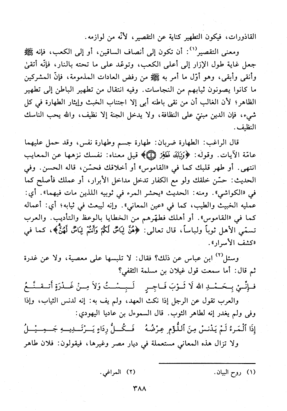 قال الراغب: الطهارة ضربان: طهارة جسم وطهارة نفس، وقد حمل عليهما عامّة الآيات. وقوله: {وَثِيَابَكَ فَطَهِّرْ (4)} قيل معناه: نفسك نزهها عن المعايب انتهى. أو طهر قلبك كما في "القاموس" أو أخلاقك فحسّن، قاله الحسن. وفي الحديث: حسّن خلقك ولو مع الكفار تدخل مداخل الأبرار، أو عملك فأصلح كما في "الكواشي". ومنه: الحديث "يحشر المرء في ثوبيه اللذين مات فيهما". أي: عمليه الخبيث والطيب، كما في "عين المعاني". وإنه ليبعث في ثيابه؛ أي: أعماله كما في "القاموس". أو أهلك فطهّرهم من الخطايا بالوعظ والتأديب. والعرب تسمّي الأهل ثوبًا ولباسًا، قال تعالى: {هُنَّ لِبَاسٌ لَكُمْ وَأَنْتُمْ لِبَاسٌ لَهُنَّ}، كما في "كشف الأسرار".