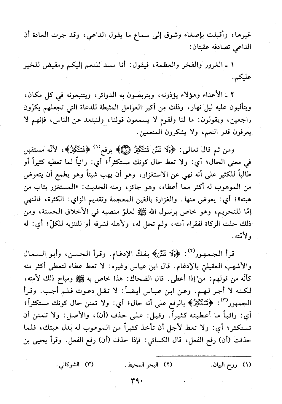 قرأ الجمهور (¬2): {وَلَا تَمْنُنْ} بفكّ الإدغام. وقرأ الحسن، وأبو السمال والأشهب العقيلييّ بالإدغام. قال ابن عباس وغيره: لا تعط عطاء لتعطى أكثر منه كأنّه من قولهم: منْ إذا أعطى. قال الضحاك: هذا خاص به - صلى الله عليه وسلم - ومباح ذلك لأمته، لكنه لا أجر لهم. وعن ابن عباس أيضًا: لا تقل دعوت فلم أحب. وقرأ الجمهور (¬3): {تَسْتَكْثِرُ} بالرفع على أنه حال؛ أي: ولا تمنن حال كونك مستكثرًا؛ أي: رائيًا ما أعطيته كثيرًا. وقيل: على حذف (أن)، والأصل: ولا تمنن أن تستكثر؛ أي: ولا تعط لأجل أن تأخذ كثيرًا من الموهوب له بدل هبتك، فلما حذفت (أن) رفع الفعل، قال الكسائي: فإذا حذف (أن) رفع الفعل. وقرأ يحيى بن