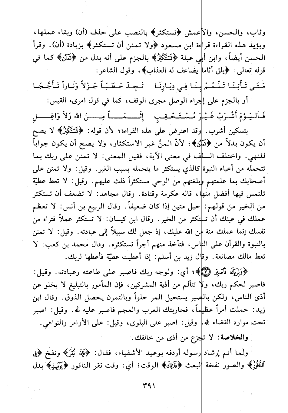 بتسكين أشر. وقد اعترض على هذه القراءة؛ لأن قوله: {تَسْتَكْثِرُ} لا يصح أن يكون بدلًا من {تَمْنُنْ}؛ لأنّ المنَّ غير الاستكثار، ولا يصح أن يكون جوابًا للنهي. واختلف السلف في معنى الآية، فقيل المعنى: لا تمنن على ربك بما تتحمله من أعباء النبوة كالذي يسشكثر ما يتحمله بسبب الغير. وقيل: ولا تمنن على أصحابك بما علمتهم وبلغتهم من الوحي مستكثرًا ذلك عليهم. وقيل: لا تعط عطيّة تلتمس فيها أفضل، قاله عكرمة وقتادة. وقال مجاهد: لا تضعف أن تستكثر من الخير من قولهم: حبل متين إذا كان ضعيفًا. وقال الربيع بن أنس: لا تعظم عملك في عينك أن من الخير. وقال ابن كيسان: لا تستكثر عملًا فتراه من نفسك إنما عملك منة من الله عليك، إذ جعل لك سبيلًا إلى عبادته. وقيل: لا تمنن بالنبوة والقرآن على الناس، فتأخذ منهم أجرًا تستكثره. وقال محمد بن كعب: لا تعط مالك مصانعة. وقال زيد بن أسلم: إذا أعطيت عطيّة فأعطها لربك.