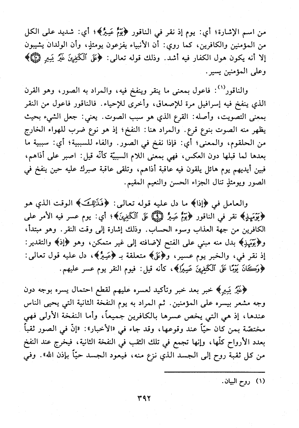 {غَيْرُ يَسِيرٍ} خبر بعد خبر وتأكيد لعسره عليهم لقطع احتمال يسره بوجه دون وجه مشعر بيسره على المؤمنين. ثم المراد به يوم النفخة الثانية التي يحيى الناس عندها، إذ هي التي يخص عسرها بالكافرين جميعًا، وأما النفخة الأولى فهي مختصّة بمن كان حيًّا عند وقوعها، وقد جاء في "الأخبار": "إنّ في الصور ثقبًا بعدد الأرواح كلّها، وإنها تجمع في تلك الثقب في النفخة الثانية، فيخرج عند النفخ من كل ثقبة روح إلى الجسد الذي نزع منه، فيعود الجسد حيًّا بإذن الله". وفي