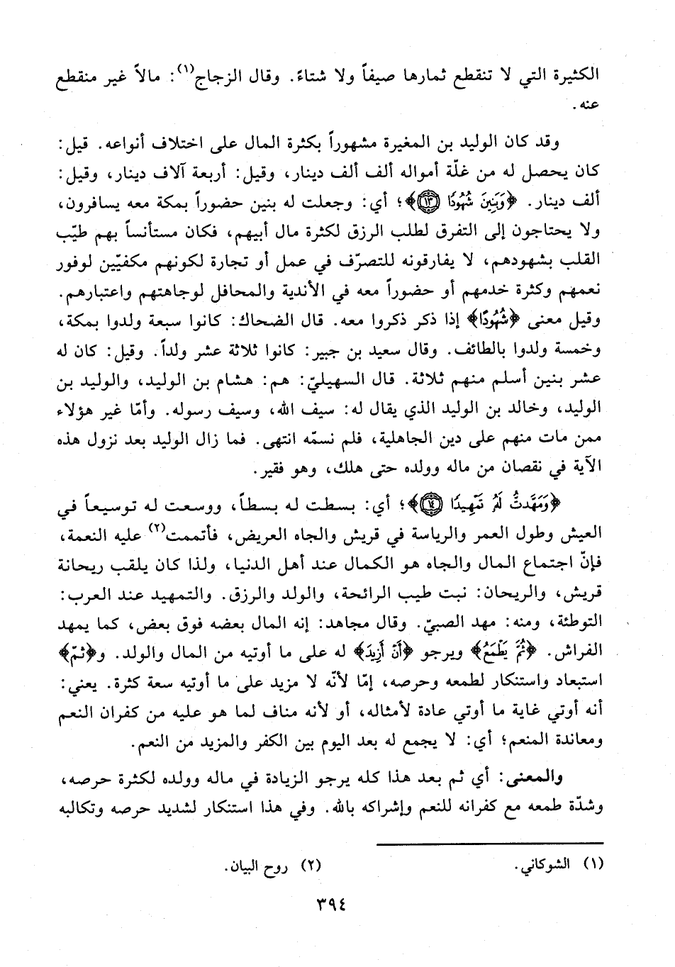 13 - {وَبَنِينَ شُهُودًا (13)}؛ أي: وجعلت له بنين حضورًا بمكة معه يسافرون، ولا يحتاجون إلى التفرق لطلب الرزق لكثرة مال أبيهم، فكان مستأنسًا بهم طيب القلب بشهودهم، لا يفارقونه للتصرّف في عمل أو تجارة لكونهم مكفيّين لوفور نعمهم وكثرة خدمهم أو حضورًا معه في الأندية والمحافل لوجاهتهم واعتبارهم. وقيل معنى {شُهُودًا} إذا ذكر ذكروا معه. قال الضحاك: كانوا سبعة ولدوا بمكة، وخمسة ولدوا بالطائف. وقال سعيد بن جبير: كانوا ثلاثة عشر ولدًا. وقيل: كان له عشر بنين أسلم منهم ثلاثة. قال السهيليّ: هم: هشام بن الوليد، والوليد بن الوليد، وخالد بن الوليد الذي يقال له: سيف الله، وسيف رسوله. وأمّا غير هؤلاء ممن مات منهم على دين الجاهلية، فلم نسمّه انتهى. فما زال الوليد بعد نزول هذه الآية في نقصان من ماله وولده حتى هلك، وهو فقير.