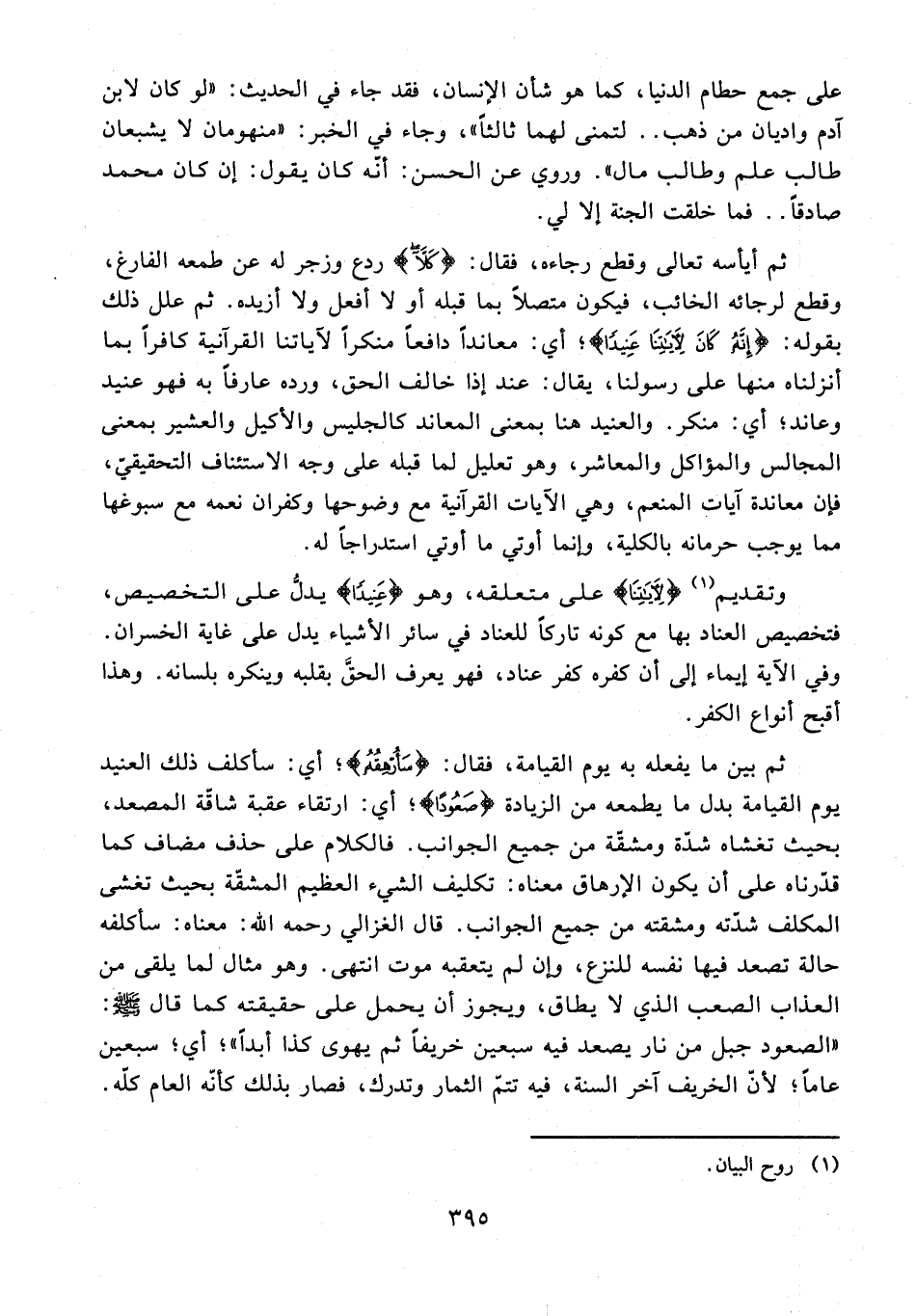 17 - ثم بين ما يفعله به يوم القيامة، فقال: {سَأُرْهِقُهُ}؛ أي: سأكلف ذلك العنيد يوم القيامة بدل ما يطمعه من الزيادة {صَعُودًا}؛ أي: ارتقاء عقبة شاقّة المصعد، بحيث تغشاه شدّة ومشقّة من جميع الجوانب. فالكلام على حذف مضاف كما قدّرناه على أن يكون الإرهاق معناه: تكليف الشيء العظيم المشقّة بحيث تغشى المكلف شدّته ومشقته من جميع الجوانب. قال الغزالي رحمه الله: معناه: سأكلفه حالة تصعد فيها نفسه للنزع، وان لم يتعقبه موت انتهى. وهو مثال لما يلقى من العذاب الصعب الذي لا يطاق، ويجوز أن يحمل على حقيقته كما قال - صلى الله عليه وسلم -: "الصعود جبل من نار يصعد فيه سبعين خريفًا ثم يهوى كذا أبدًا"؛ أي: سبعين عامًا؛ لأنّ الخريف آخر السنة، فيه تتمّ الثمار وتدرك، فصار بذلك كأنّه العام كلّه.