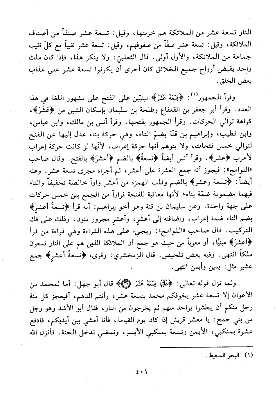 وقرأ الجمهور (¬1): {تِسْعَةَ عَشَرَ} مبنيّين على الفتح على مشهور اللغة في هذا العدد. وقرأ أبو جعفر بن القعقاع وطلحة بن سليمان بإسكان الشين من {عَشْرَ}، كراهة توالي الحركات. وقرأ الجمهور بفتحها. وقرأ أنس بن مالك، وابن عباس، وابن قطيب، وإبراهيم بن قنّة بضمّ التاء، وهي حركة بناء عدل إليها عن الفتح لتوالي خمس فتحات، ولا يتوهم أنها حركة إعراب؛ لأنّها لو كانت حركة إعراب لأعرب {عشر}. وقرأ أنس أيضًا {تسعةُ} بالضم {أعشرَ} بالفتح. وقال صاحب "اللوامح": فيجوز أنه جمع العشرة على أعثر، ثم أجراه مجرى تسعة عشر. وعنه أيضًا: {تسعة وعشر} بالضم وقلب الهمزة من أعثر واوًا خالصة تخفيفًا والتاء فيهما مضمومة ضمّة بناء؛ لأنها معاقبة للفتحة فرارًا من الجمع بين خمس حركات على جهة واحدة. وعن سليمان بن قنة وهو أخو إبراهيم: أنه قرأ {تسعةُ أعشرٍ} بضم التاء ضمة إعراب، وإضافته إلى أعشرٍ، وأعشرٍ مجرور منون، وذلك على فك التركيب. قال صاحب "اللوامح": ويجيء على هذه القراءة وهي قراءة من قرأ {أعشرَ} مبنيًّا، أو معربًا من حيث هو جمع أن الملائكة الذين هم على النار تسعون ملكًا نتهى. وفيه بعض تلخيص. قال الزمخشري: وقرىء {تسعةُ أعشرٍ} جمع عشير مثل: يمين وأيمن انتهى.