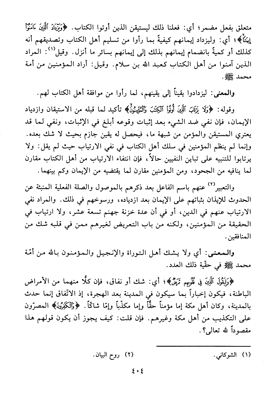 وقوله: {وَلَا يَرْتَابَ الَّذِينَ أُوتُوا الْكِتَابَ وَالْمُؤْمِنُونَ} تأكيد لما قبله من الاستيقان وازدياد الإيمان، فإن نفي ضد الشيء بعد إثبات وقوعه أبلغ في الإثبات، ونفي لما قد يعتري المستيقن والمؤمن من شبهة ما، فيحصل له يقين جازم بحيث لا شك بعده. وإنما لم ينظم المؤمنين في سلك أهل الكتاب في نفي الارتياب حيث لم يقل: ولا يرتابوا للتنبيه على تباين النفيين حالًا، فإن انتفاء الارتياب من أهل الكتاب مقارن لما ينافيه من الجحود، ومن المؤمنين مقارن لما يقتضيه من الإيمان وكم بينهما.