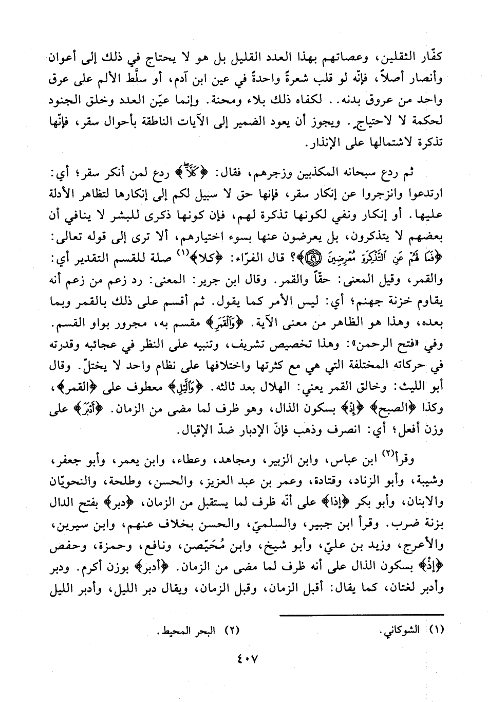 32 - ثم ردع سبحانه المكذبين وزجرهم، فقال: {كَلَّا} ردع لمن أنكر سقر؛ أي: ارتدعوا وانزجروا عن إنكار سقر، فإنها حق لا سبيل لكم إلى إنكارا لتظاهر الأدلة عليها. أو إنكار ونفي لكونها تذكرة لهم، فإن كونها ذركما للبشر لا ينافي أن بعضهم لا يتذكرون، بل يعرضون عنها بسوء اختيارهم، ألا ترى إلى قوله تعالى: {فَمَا لَهُمْ عَنِ التَّذْكِرَةِ مُعْرِضِينَ (49)}؟ قال الفرّاء: {كلا} (¬1) صلة للقسم التقدير أي: والقمر، وقيل المعنى: حقًّا والقمر. وقال ابن جرير: المعنى: رد زعم من زعم أنه يقاوم خزنة جهنم؛ أي: ليس الأمر كما يقول. ثم أقسم على ذلك بالقمر وبما بعده، وهذا هو الظاهر من معنى الآية. {وَالقَمَرِ} مقسم به، مجرور بواو القسم. وفي "فتح الرحمن": وهذا تخصيص تشريف، وتنبيه على النظر في عجائبه وقدرته في حركاته المختلفة التي هي مع كثرتها واختلافها على نظام واحد لا يختل. وقال أبو الليث: وخالق القمر يعني: الهلال بعد ثالثه.
