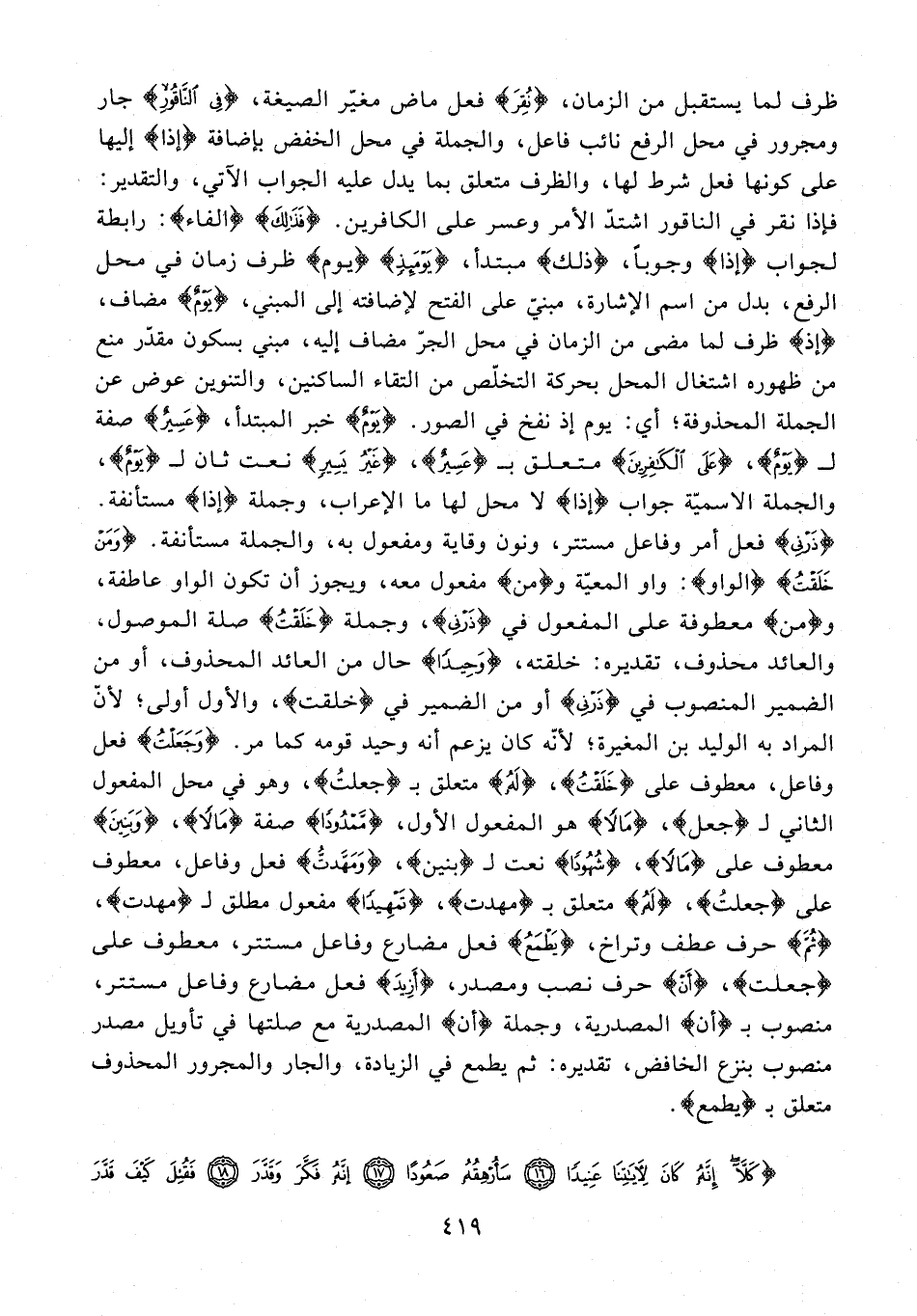 ظرف لما يستقبل من الزمان، {نُقِرَ} فعل ماض مغيّر الصيغة، {فِي النَّاقُورِ} جار ومجرور في محل الرفع نائب فاعل، والجملة في محل الخفض بإضافة {إذا} إليها على كونها فعل شرط لها، والظرف متعلق بما يدل عليه الجواب الآتي، والتقدير: فإذا نقر في الناقور اشتدّ الأمر وعسر على الكافرين. {فَذَلِكَ} {الفاء}: رابطة لجواب {إذا} وجوبًا، {ذلك} مبتدأ، {يَوْمَئِذٍ} {يوم} ظرف زمان في محل الرفع، بدل من اسم الإشارة، مبنيّ على الفتح لإضافته إلى المبني، {يَوْمٌ} مضاف، {إذ} ظرف لما مضى من الزمان في محل الجرّ مضاف إليه، مبني بسكون مقدر منع من ظهوره اشتغال المحل بحركة التخلّص من التقاء الساكنين، والتنوين عوض عن الجملة المحذوفة؛ أي: يوم إذ نفخ في الصور. {يَوْمٌ} خبر المبتدأ، {عَسِيرٌ} صفة لـ {يَوْمٌ}، {عَلَى الْكَافِرِينَ} متعلق بـ {عَسِيرٌ}، {غَيْرُ يَسِيرٍ} نعت ثان لـ {يَوْمٌ}، والجملة الاسميّة جواب {إذا} لا محل لها من الإعراب، وجملة {إذا} مستأنفة. {ذَرْنِي} فعل أمر وفاعل مستتر، ونون وقاية ومفعول به، والجملة مستأنفة. {وَمَنْ خَلَقْتُ} {الواو}: واو المعيّة و {من} مفعول معه، ويجوز أن تكون الواو عاطفة، و {من} معطوفة على المفعول في {ذَرْنِي}، وجملة {خَلَقْتُ} صلة الموصول، والعائد محذوف، تقديره: خلقته، {وَحِيدًا} حال من العائد المحذوف، أو من الضمير المنصوب في {ذَرْنِي} أو من الضمير في {خلقت}، والأول أولى؛ لأنّ المراد به الوليد بن المغيرة؛ لأنّه كان يزعم أنه وحيد قومه كما مر. {وَجَعَلْتُ} فعل وفاعل، معطوف على {خَلَقْتُ}، {لَهُ} متعلق بـ {جعلتُ}، وهو في محل المفعول الثاني لـ {جعل}، {مَالًا} هو المفعول الأول، {مَمْدُودًا} صفة {مَالًا}، {وَبَنِينَ} معطوف على {مَالًا}، {شُهُودًا} نعت لـ {وبنين}، {وَمَهَّدْتُ} فعل وفاعل، معطوف على {جعلتُ}، {لَهُ} متعلق بـ {مهدت}، {تَمْهِيدًا} مفعول مطلق لـ {مهدت}، {ثم} حرف عطف وتراخ، {يَطمَعُ} فعل مضارع وفاعل مستتر، معطوف على {جعلت}، {أَن} هو حرف نصب ومصدر، {أَزِيدَ} فعل مضارع وفاعل مستتر، منصوب بـ {أن} المصدرية، وجملة {أن} المصدرية مع صلتها في تأويل مصدر منصوب بنزع الخافض، تقديره: ثم يطمع في الزيادة، والجار والمجرور المحذوف متعلق بـ {يطمع}.