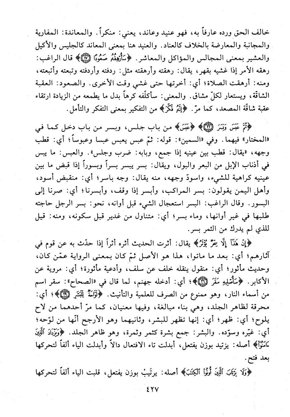 {إِنْ هَذَا إِلَّا سِحْرٌ يُؤْثَرُ} يقال: أثرت الحديث أثره أثرًا إذا حدّث به عن قوم في آثارهم؛ أي: بعدما ماتوا، هذا هو الأصل ثمّ كان بمعنى الرواية عمّن كان، وحديث مأثور؛ أي: منقول ينقله خلف عن سلف، وأدعية ماثورة؛ أي: مروية عن الأكابر. {سَأُصْلِيهِ سَقَرَ (26)}؛ أي: أدخله جهنم، لما قال في "الصحاح": سقر اسم من أسماء النار، وهو ممنوع من الصرف للعلمية والتأنيث. {لَوَّاحَةٌ لِلْبَشَرِ (29)}؛ أي: محرقة لظاهر الجلد، وهي بناء مبالغة، وفيها معنيان، كما مرّ أحدهما من لاح يلوح؛ أي: ظهر؛ أي: إنها تظهر للبشر، وثانيهما وهو الأرجح أنّها من لوّحه؛ أي: غيّره وسوّده. والبشر: جمع بشرة كثمر وثمرة، وهو ظاهر الجلد. {وَيَزْدَادَ الَّذِينَ آمَنُوا} أصله: يزتيد بوزن يفتعل، أبدلت تاء الافتعال دالًا وأبدلت الياء ألفًا لتحركها بعد فتح.