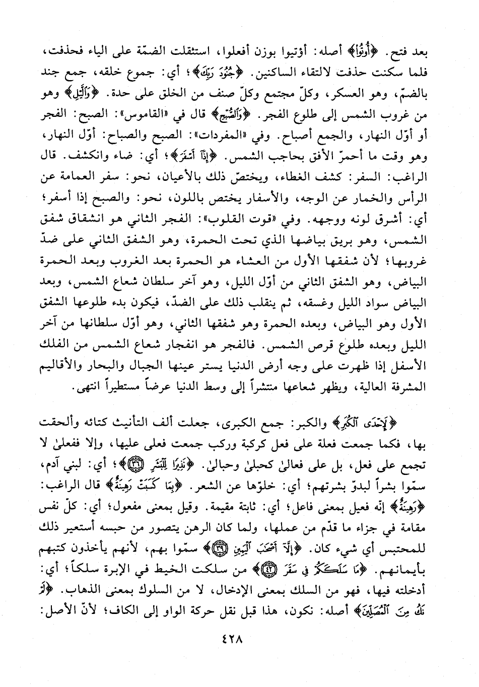 بعد فتح. {أُوتُوا} أصله: أؤتيوا بوزن أفعلوا، استثقلت الضمّة على الياء فحذفت، فلما سكنت حذفت لالتقاء الساكنين. {جُنُودَ رَبِّكَ}؛ أي: جموع خلقه، جمع جند بالضمّ، وهو العسكر، وكلّ مجتمع وكلّ صنف من الخلق على حدة. {وَاللَّيْلِ} وهو من غروب الشمس إلى طلوع الفجر. {وَالصُّبح} قال في "القاموس": الصبح: الفجر أو أوّل النهار، والجمع أصباح. وفي "المفردات": الصبح والصباح: أوّل النهار، وهو وقت ما أحمرّ الأفق بحاجب الشمس. {إِذَا أَسْفَرَ}؛ أي: ضاء وانكشف. قال الراغب: السفر: كشف الغطاء، ويختصّ ذلك بالأعيان، نحو: سفر العمامة عن الرأس والخمار عن الوجه، والأسفار يختص باللون، نحو: والصبح إذا أسفر؛ أي: أشرق لونه ووجهه. وفي "قوت القلوب": الفجر الثاني هو انشقاق شفق الشمس، وهو بريق بياضها الذي تحت الحمرة، وهو الشفق الثاني على ضدّ غروبها؛ لأن شفقها الأول من العشاء هو العمرة بعد الغروب وبعد العمرة البياض، وهو الشفق الثاني من أوّل الليل، وهو آخر سلطان شعاع الشمس، وبعد البياض سواد الليل وغسقه، ثم ينقلب ذلك على الضدّ، فيكون بدء طلوعها الشفق الأول وهو البياض، وبعده العمرة وهو شفقها الثاني، وهو أوّل سلطانها من آخر الليل وبعده طلوع قرص الشمس. فالفجر هو انفجار شعاع الشمس من الفلك الأسفل إذا ظهرت على وجه أرض الدنيا يستر عينها الجبال والبحار والأقاليم المشرفة العالية، ويظهر شعاعها منتشرًا إلى وسط الدنيا عرضًا مستطيرًا انتهى.