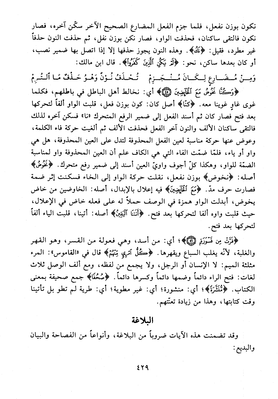 {وَكُنَّا نَخُوضُ مَعَ الْخَائِضِينَ (45)} أي: نخالط أهل الباطل في باطلهم، فكلما غوى غاوٍ غوينا معه. {كنا} أصل كان: كون بوزن فعل، قلبت الواو ألفًا لتحركها بعد فتح فصار كان ثم أسند الفعل إلى ضمير الرفع المتحرك "نا" فسكن آخره لذلك فالتقى ساكنان الألف والنون آخر الفعل فحذفت الألف ثم ألغيت حركة فاء الكلمة، وعوض عنها حورة مناسبة لعين الفعل المحذوفة لتدل على العين المحذوفة، هل هي واو أو ياء، فلمّا ضمّت الفاء التي هي الكاف علم أن العين المحذوفة واو لمناسبة الضمّة للواو، وهكذا كلّ أجوف واويّ العين أسند إلى ضمير رفع متحرك. {نَخُوضُ} أصله: {نخوض} بوزن نفعل، نقلت حركة الواو إلى الخاء فسكنت إثر ضمة فصارت حرف مدّ. {مَعَ الْخَائِضِينَ} فيه إعلال بالإبدال، أصله: الخاوضين من خاض يخوض، أبدلت الواو همزة في الوصف حملًا له على فعله خاض في الإعلال، حيث قلبت واوه ألفا لتحركها بعد فتح. {أَتَانَا الْيَقِينُ} أصله: أتينا، قلبت الياء ألفًا لتحركها بعد فتح.