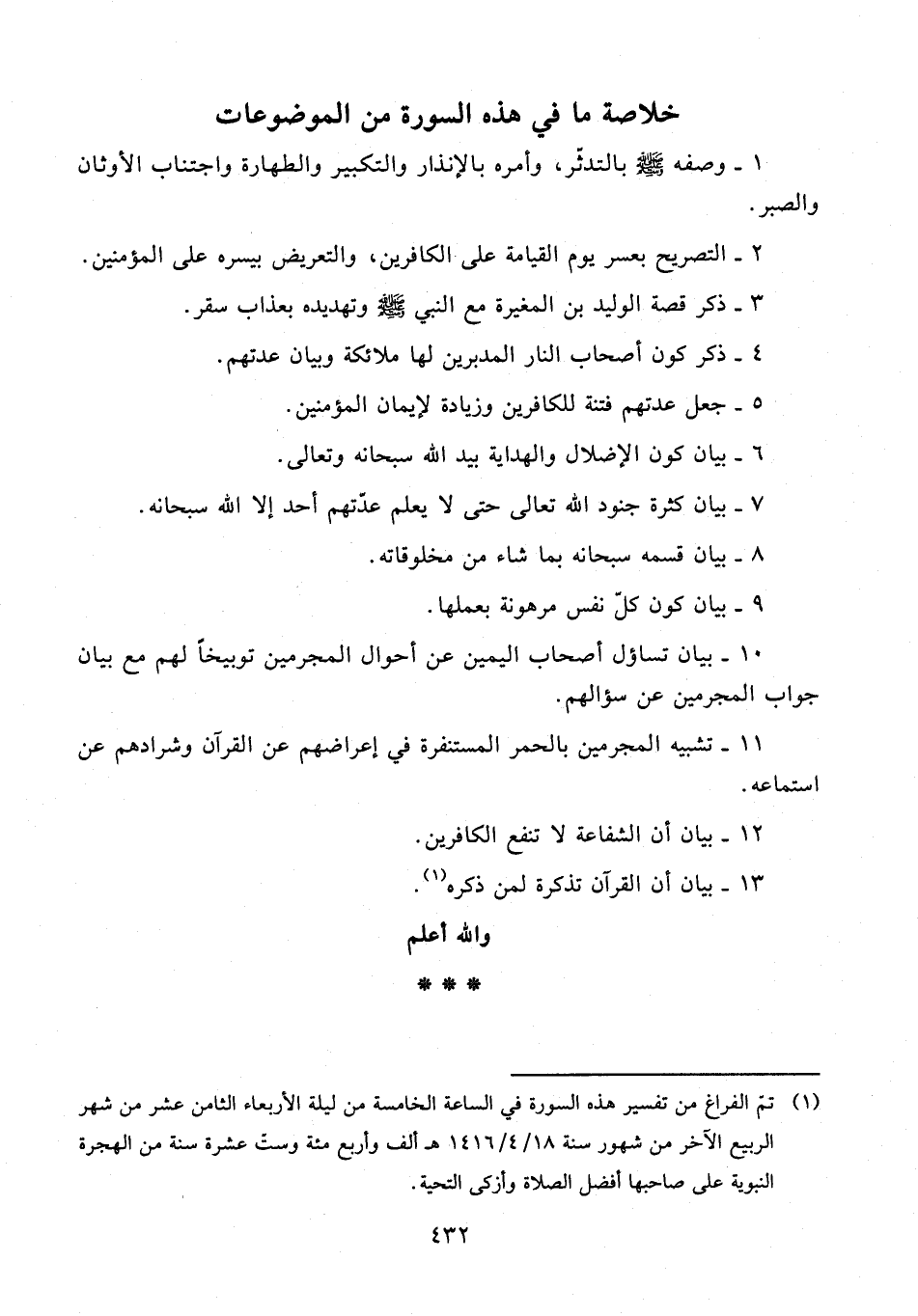 (¬1) تمّ الفراغ من تفسير هذه السورة في الساعة الخامسة من ليلة الأربعاء الثامن عشر من شهر الربيع الآخر من شهور سنة 18/ 4/ 1416 هـ ألف وأربع مئة وست عشرة سنة من الهجرة النبوية على صاحبها أفضل الصلاة وأزكى التحية.