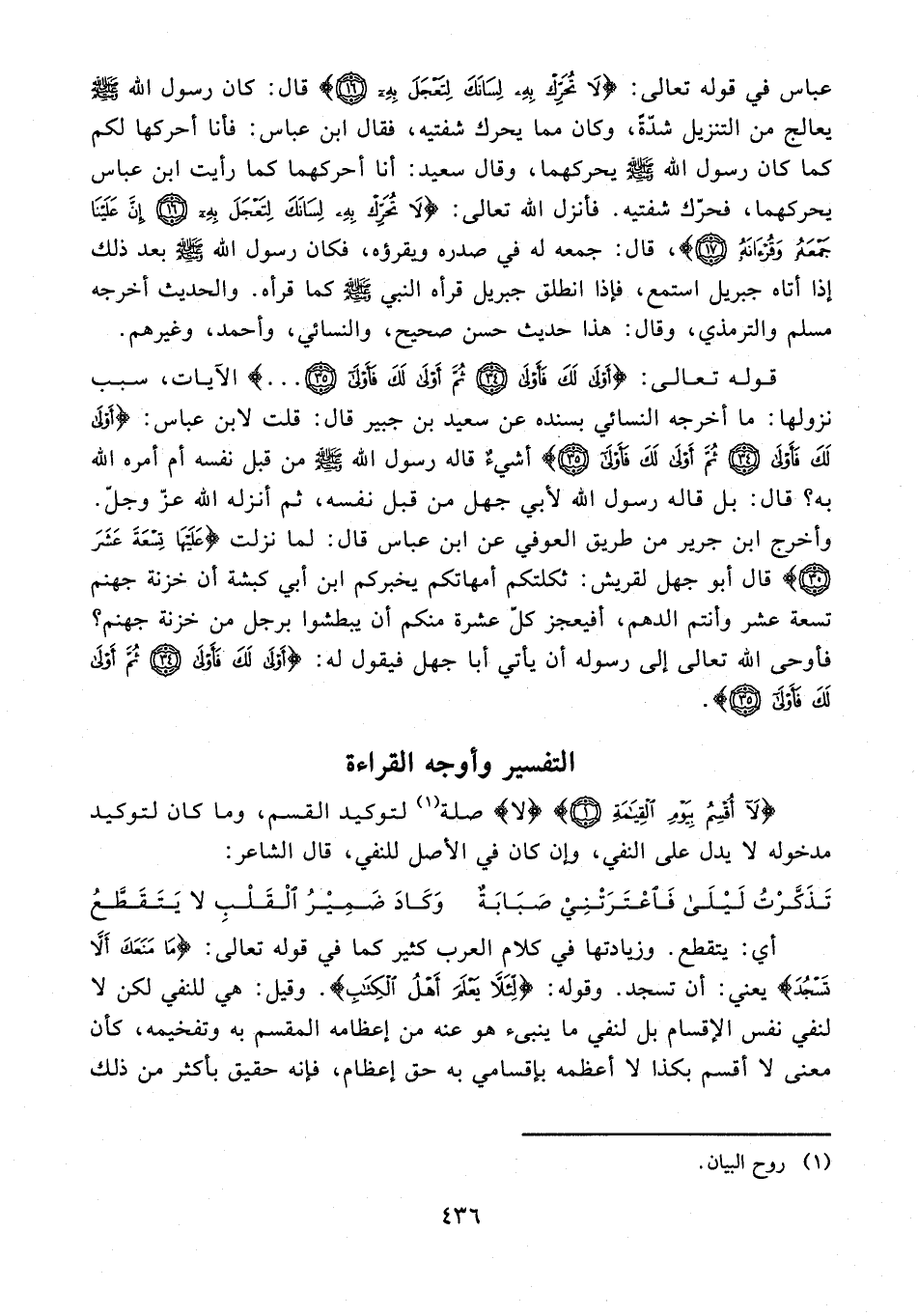 عباس في قوله تعالى: {لَا تُحَرِّكْ بِهِ لِسَانَكَ لِتَعْجَلَ بِهِ (16)} قال: كان رسول الله - صلى الله عليه وسلم - يعالج من التنزيل شدّةً، وكان مما يحرك شفتيه، فقال ابن عباس: فأنا أحركها لكم كما كان رسول الله - صلى الله عليه وسلم - يحركهما، وقال سعيد: أنا أحركهما كما رأيت ابن عباس يحركهما، فحرّك شفتيه. فأنزل الله تعالى: {لَا تُحَرِّكْ بِهِ لِسَانَكَ لِتَعْجَلَ بِهِ (16) إِنَّ عَلَيْنَا جَمْعَهُ وَقُرْآنَهُ (17)}، قال: جمعه له في صدره ويقرؤه، فكان رسول الله - صلى الله عليه وسلم - بعد ذلك إذا أتاه جبريل استمع، فإذا انطلق جبريل قرأه النبي - صلى الله عليه وسلم - كما قرأه. والحديث أخرجه مسلم والترمذي، وقال: هذا حديث حسن صحيح، والنسائي، وأحمد، وغيرهم.