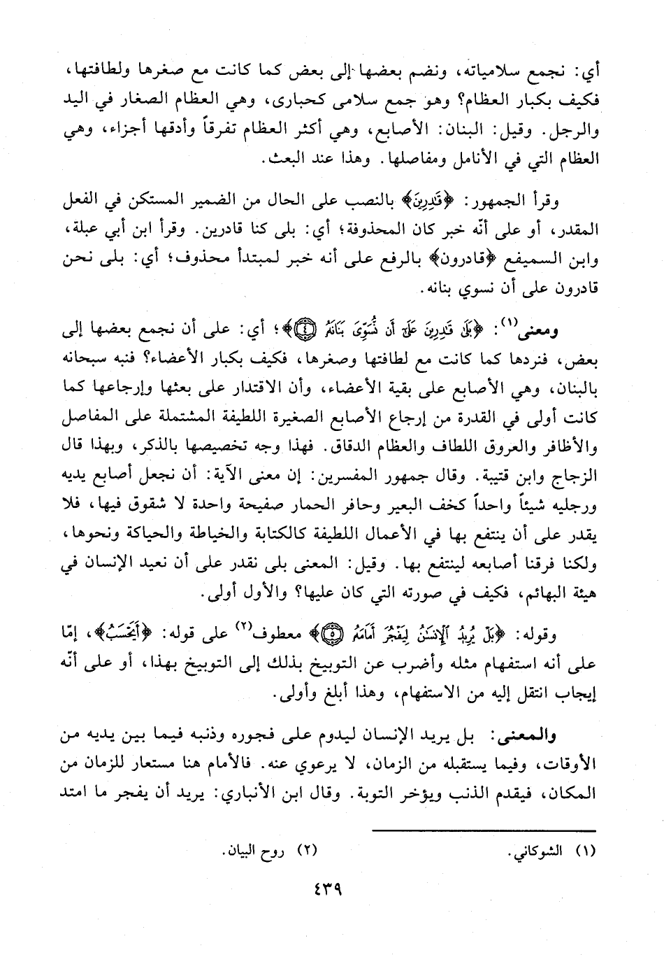 ومعنى (¬1): {بَلَى قَادِرِينَ عَلَى أَنْ نُسَوِّيَ بَنَانَهُ (4)}؛ أي: على أن نجمع بعضها إلى بعض، فنردها كما كانت مع لطافتها وصغرها، فكيف بكبار الأعضاء؟ فنبه سبحانه بالبنان، وهي الأصابع على بقية الأعضاء، وأن الاقتدار على بعثها وإرجاعها كما كانت أولى في القدرة من إرجاع الأصابع الصغيرة اللطيفة المشتملة على المفاصل والأظافر والعروق اللطاف والعظام الدقاق. فهذا وجه تخصيصها بالذكر، وبهذا قال الزجاج وابن قتيبة. وقال جمهور المفسرين: إن معنى الآية: أن نجعل أصابع يديه ورجليه شيئًا واحدًا كخف البعير وحافر الحمار صفيحة واحدة لا شقوق فيها، فلا يقدر على أن ينتفع بها في الأعمال اللطيفة كالكتابة والخياطة والحياكة ونحوها، ولكنا فرقنا أصابعه لينتفع بها. وقيل: المعنى بلى نقدر على أن نعيد الإنسان في هيئة البهائم، فكيف في صورته التي كان عليها؟ والأول أولى.