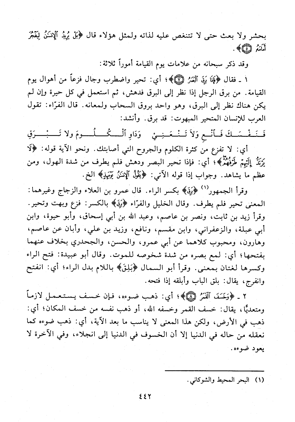 1 - فقال {فَإِذَا بَرِقَ الْبَصَرُ (7)}؛ أي: تحير واضطرب وجال فزعًا من أهوال يوم القيامة. من برق الرجل إذا نظر إلى البرق فدهش، ثم استعمل في كل حيرة وإن لم يكن هناك نظر إلى البرق، وهو واحد بروق السحاب ولمعانه. قال الفرّاء: تقول العرب للإنسان المتحير المبهوت: قد برق. وأنشد: