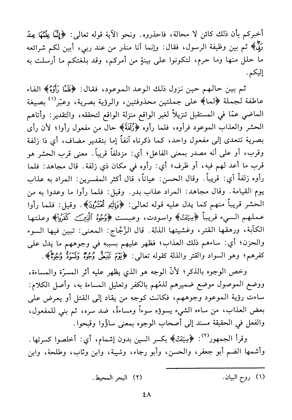 27 - ثم بين حالهم حين نزول ذلك الوعد الموعود، فقال: {فَلَمَّا رَأَوْهُ} الفاء عاطفة لجملة {لما} على جملتين محذوفتين، والرؤية بصرية، وعبّر (¬1) بصيغة الماضي عما في المستقبل تنزيلًا لغير الواقع منزلة الواقع لتحققه، والتقدير: وأتاهم الحشر والعذاب الموعود فرأوه، فلما رأوه {زُلْفَةً} حال من مفعول رأوا؛ لأن رأى بصرية تتعدى إلى مفعول واحد، كما ذكرناه آنفًا إما بتقدير مضاف، أي ذا زلفة وقرب، أو على أنه مصدر بمعنى الفاعل؛ أي: مزدلفًا قريبًا. معنى قرب الحشر هو قرب ما أعد لهم فيه، أو ظرف؛ أي: رأوه في مكان ذي زلفة. قال مجاهد: فلما رأوه زلفة أي: قريبًا. وقال الحسن: عيانًا، قال أكثر المفسرين: المراد به عذاب يوم القيامة. وقال مجاهد: المراد عذاب بدر. وقيل: فلما رأوا ما وعدوا به من الحشر قريبًا منهم كما يدل عليه قوله تعالى: {وَإِلَيْهِ تُحْشَرُونَ}. وقيل: فلما رأوا عملهم السيء قريبًا {سِيئَتْ} واسودت، وعبست {وُجُوهُ الَّذِينَ كَفَرُوا} وعلتها الكآبة، ورهقها القتر، وغشيتها الذلة. قال الزَّجَّاج: المعنى: تبين فيها السوء والحزن؛ أي: ساءهم ذلك العذاب؛ فظهر عليهم بسببه في وجوههم ما يدل على كفرهم؛ وهو السواد والقتر والذلة كقوله تعالى: {يَوْمَ تَبْيَضُّ وُجُوهٌ وَتَسْوَدُّ وُجُوهٌ}.