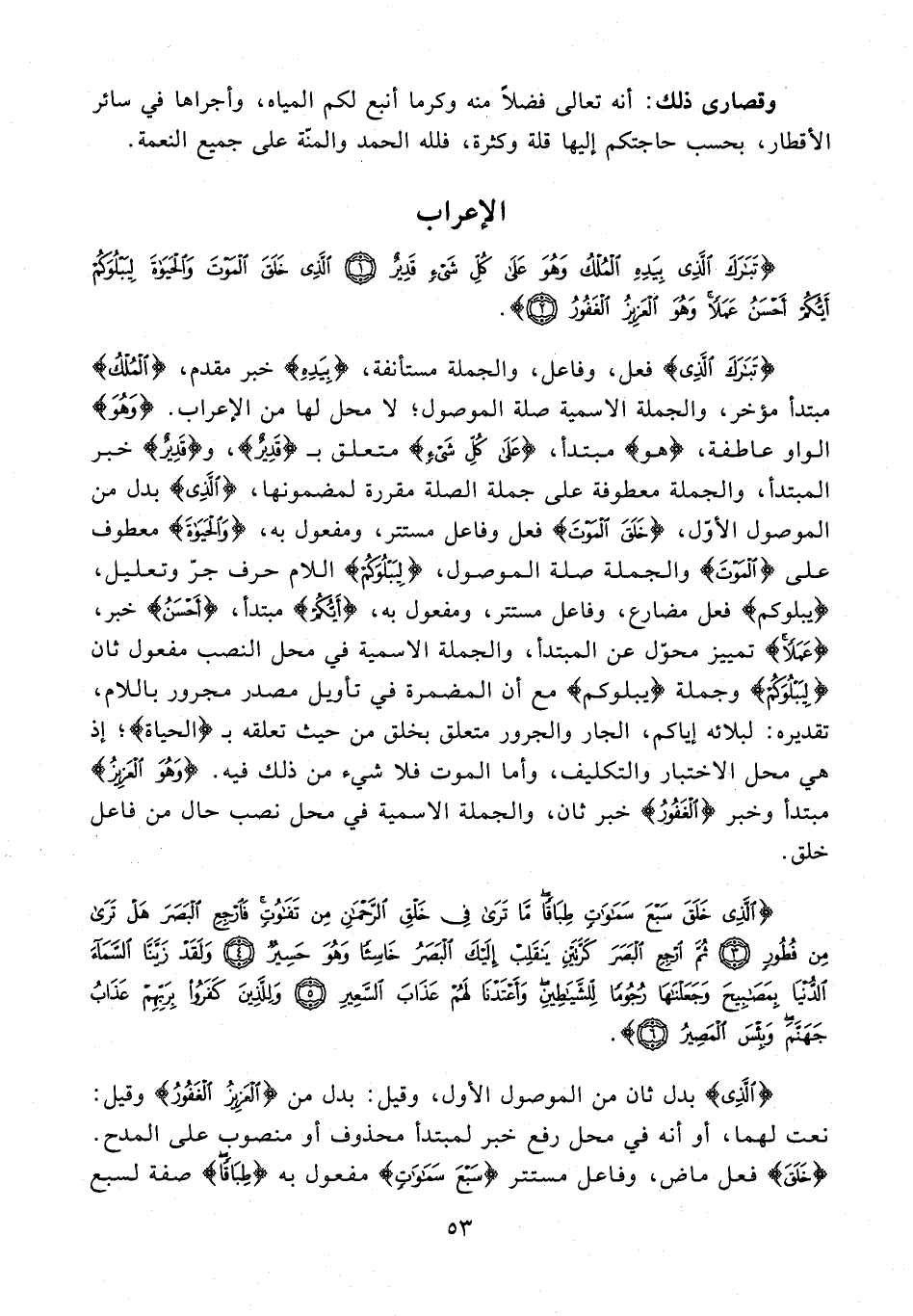 {تَبَارَكَ الَّذِي} فعل، وفاعل، والجملة مستأنفة، {بِيَدِهِ} خبر مقدم، {الْمُلْكُ} مبتدأ مؤخر، والجملة الاسمية صلة الموصول؛ لا محل لها من الإعراب. {وَهُوَ} الواو عاطفة، {هو} مبتدأ، {عَلَى كُلِّ شَيْءٍ} متعلق بـ {قَدِيرٌ}، و {قَدِيرٌ} خبر المبتدأ، والجملة معطوفة على جملة الصلة مقررة لمضمونها، {الَّذِي} بدل من الموصول الأوّل، {خَلَقَ الْمَوْتَ} فعل وفاعل مستتر، ومفعول به، {وَالْحَيَاةَ} معطوف على {الْمَوْتَ} والجملة صلة الموصول، {لِيَبْلُوَكُمْ} اللام حرف جرّ وتعليل، {يبلوكم} فعل مضارع، وفاعل مستتر، ومفعول به، {أَيُّكُمْ} مبتدأ، {أَحْسَنُ} خبر، {عَمَلًا} تمييز محوّل عن المبتدأ، والجملة الاسمية في محل النصب مفعول ثان {لِيَبْلُوَكُمْ} وجملة {يبلوكم} مع أن المضمرة في تأويل مصدر مجرور باللام، تقديره: لبلائه إياكم، الجار والجرور متعلق بخلق من حيث تعلقه بـ {الحياة}؛ إذ هي محل الاختبار والتكليف، وأما الموت فلا شيء من ذلك فيه. {وَهُوَ الْعَزِيزُ} مبتدأ وخبر {الْغَفُورُ} خبر ثان، والجملة الاسمية في محل نصب حال من فاعل خلق.