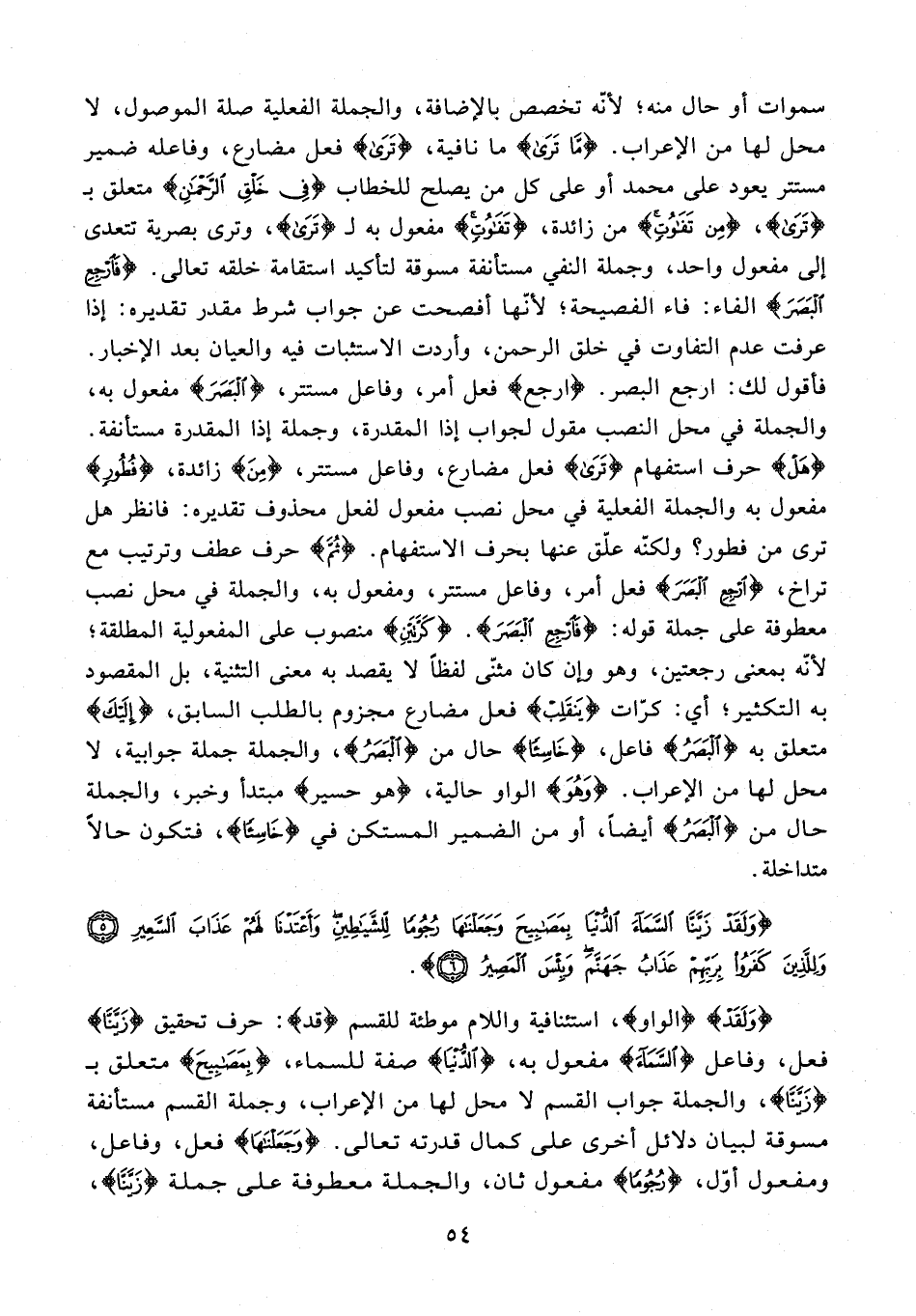 سموات أو حال منه؛ لأنّه تخصص بالإضافة، والجملة الفعلية صلة الموصول، لا محل لها من الإعراب. {مَا تَرَى} ما نافية، {تَرَى} فعل مضارع، وفاعله ضمير مستتر يعود على محمد أو على كل من يصلح للخطاب {فِي خَلْقِ الرَّحْمَنِ} متعلق بـ {تَرَى}، {مِنْ تَفَاوُتٍ} من زائدة، {تَفَاوُتٍ} مفعول به لـ {تَرَى}، وترى بصرية تتعدى إلى مفعول واحد، وجملة النفي مستأنفة مسوقة لتأكيد استقامة خلقه تعالى. {فَارْجِعِ الْبَصَرَ} الفاء: فاء الفصيحة؛ لأنّها أفصحت عن جواب شرط مقدر تقديره: إذا عرفت عدم التفاوت في خلق الرحمن، وأردت الاستثبات فيه والعيان بعد الإخبار. فأقول لك: ارجع البصر. {ارجع} فعل أمر، وفاعل مستتر، {الْبَصَرَ} مفعول به، والجملة في محل النصب مقول لجواب إذا المقدرة، وجملة إذا المقدرة مستأنفة. {هَلْ} حرف استفهام {تَرَى} فعل مضارع، وفاعل مستتر، {مِنْ} زائدة، {فُطُورٍ} مفعول به والجملة الفعلية في محل نصب مفعول لفعل محذوف تقديره: فانظر هل ترى من فطور؟ ولكنّه علّق عنها بحرف الاستفهام. {ثُمَّ} حرف عطف وترتيب مع تراخ، {ارْجِعِ الْبَصَرَ} فعل أمر، وفاعل مستتر، ومفعول به، والجملة في محل نصب معطوفة على جملة قوله: {فَارْجِعِ الْبَصَرَ}. {كَرَّتَيْنِ} منصوب على المفعولية المطلقة؛ لأنّه بمعنى رجعتين، وهو وإن كان مثنّى لفظًا لا يقصد به معنى التثنية، بل المقصود به التكثير؛ أي: كرّات {يَنْقَلِبْ} فعل مضارع مجزوم بالطلب السابق، {إِلَيْكَ} متعلق به {الْبَصَرَ} فاعل، {خَاسِئًا} حال من {الْبَصَرَ}، والجملة جملة جوابية، لا محل لها من الإعراب. {وَهُوَ} الواو حالية، {هُوَ حَسِيرٌ} مبتدأ وخبر، والجملة حال من {الْبَصَرَ} أيضًا، أو من الضمير المستكن في {خَاسِئًا}، فتكون حالًا متداخلة.