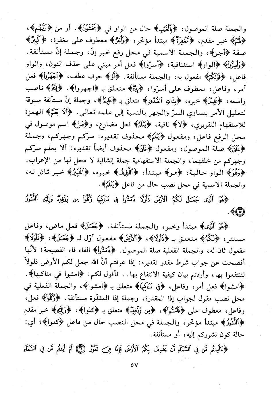 والجملة صلة الموصول، {بِالْغَيْبِ} حال من الواو في {يَخْشَوْنَ}، أو من {رَبَّهُمْ}، {لَهُمْ} خبر مقدم، {مَغْفِرَةٌ} مبتدأ مؤخّر، {وَأَجْرٌ} معطوف على مغفرة، {كَبِيرٌ} صفة {أجر}، والجملة الاسمية في محل رفع خبر إنّ، وجملة إنّ مستأنفة. {وَأَسِرُّوا} {الواو} استئنافية، {أسرّوا} فعل أمر مبني على حذف النون، والواو فاعل، {قَوْلَكُمْ} مفعول به، والجملة مستأنفة. {أَوْ} حرف عطف، {اجْهَرُوا} فعل أمر، وفاعل، معطوف على أسرّوا، {بِهِ} متعلق بـ {اجْهَرُوا}. {إنَّه} ناصب واسمه، {عَلِيمٌ} خبره، {بِذَاتِ الصُّدُورِ} متعلق بـ {عَلِيمٌ}، وجملة إنّ مستأنفة مسوقة لتعليل الأمر بتساوي السرّ والجهر بالنسبة إلى علمه تعالى. {أَلَا يَعْلَمُ} الهمزة للاستفهام التقريري، {لا} نافية، {يَعْلَمُ} فعل مضارع، و {مَنْ} اسم موصول في محل الرفع فا عل، ومفعول {يَعْلَمُ} محذوف تقديره: سرّكم وجهركم، وجملة {خَلَقَ} صلة الموصول، ومفعول {خَلَقَ} محذوف أيضًا تقديره: ألا يعلم سرّكم وجهركم من خلقهما، والجملة الاستفهامية جملة إنشائية لا محل لها من الإعراب. {وَهُوَ} الواو حالية، {هو} مبتدأ، {اللَّطِيفُ} خبره، {الْخَبِيرُ} خبر ثانٍ له، والجملة الاسمية في محل نصب حال من فاعل {يَعْلَمُ}.