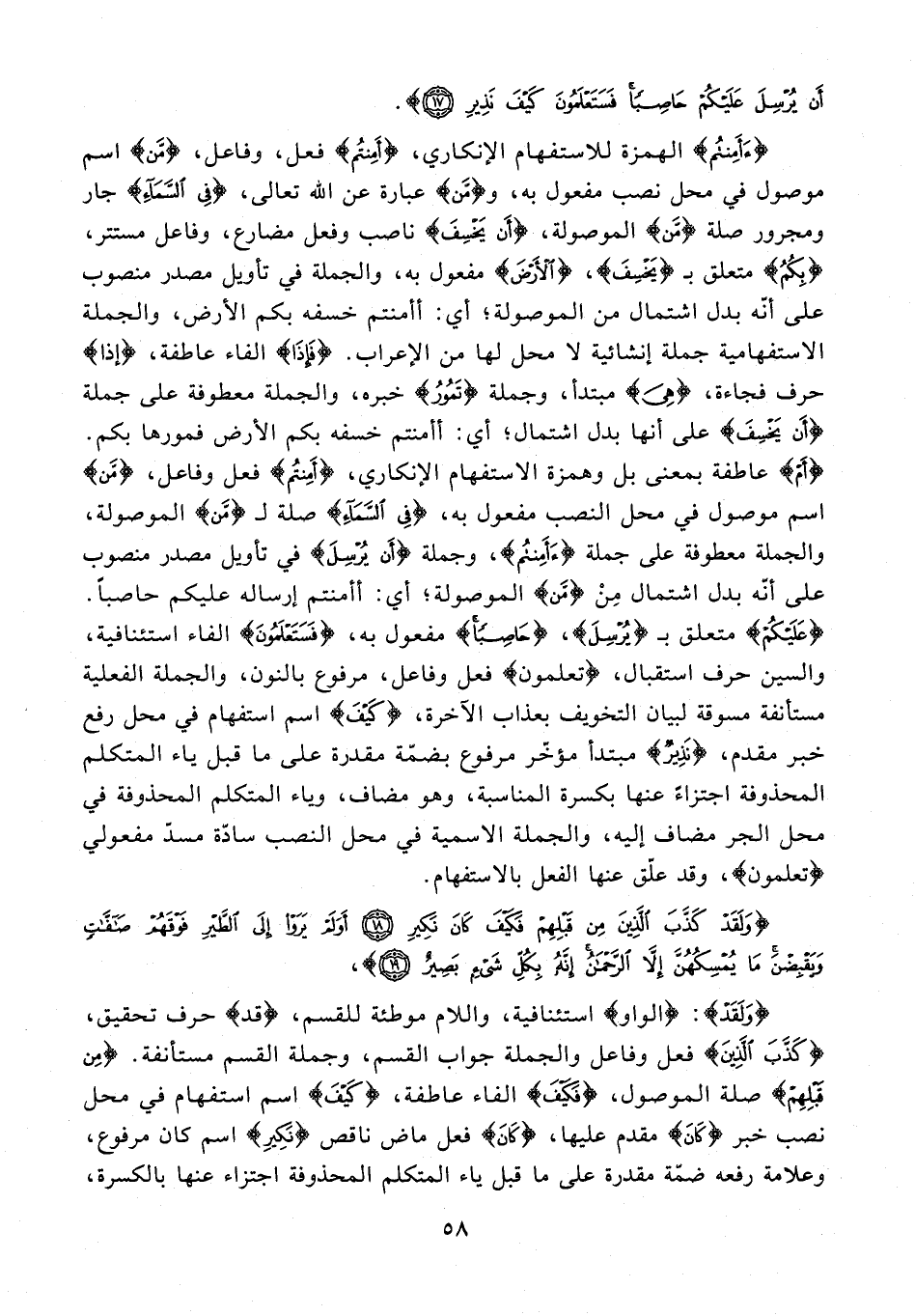 {أأَمِنْتُمْ} الهمزة للاستفهام الإنكاري، {أَمِنْتُمْ} فعل، وفاعل، {مَنْ} اسم موصول في محل نصب مفعول به، و {مَنْ} عبارة عن الله تعالى، {فِي السَّمَاءِ} جار ومجرور صلة {مَنْ} الموصولة، {أَن يَخْسِفَ} ناصب وفعل مضارع، وفاعل مستتر، {بِكُمُ} متعلق بـ {يَخْسِفَ}، {الْأَرْضَ} مفعول به، والجملة في تأويل مصدر منصوب على أنّه بدل اشتمال من الموصولة؛ أي: أأمنتم خسفه بكم الأرض، والجملة الاستفهامية جملة إنشائية لا محل لها من الإعراب. {فَإِذَا} الفاء عاطفة، {إذا} حرف فجاءة، {هِيَ} مبتدأ، وجملة {تَمُورُ} خبره، والجملة معطوفة على جملة {أَنْ يَخْسِفَ} على أنها بدل اشتمال؛ أي: أأمنتم خسفه بكم الأرض فمورها بكم. {أَمْ} عاطفة بمعنى بل وهمزة الاستفهام الإنكاري، {أَمِنْتُمْ} فعل وفاعل، {مَنْ} اسم موصول في محل النصب مفعول به، {فِي السَّمَاءِ} صلة لـ {مَنْ} الموصولة، والجملة معطوفة على جملة {أَمِنْتُمْ}، وجملة {أَنْ يُرْسِلَ} في تأويل مصدر منصوب على أنّه بدل اشتمال مِنْ {مَنْ} الموصولة؛ أي: أأمنتم إرساله عليكم حاصبًا. {عَلَيْكُمْ} متعلق بـ {يُرْسِلَ}، {حَاصِبًا} مفعول به، {فَسَتَعْلَمُونَ} الفاء استئنافية، والسين حرف استقبال، {تعلمون} فعل وفاعل، مرفوع بالنون، والجملة الفعلية مستأنفة مسوقة لبيان التخويف بعذاب الآخرة، {كَيْفَ} اسم استفهام في محل رفع خبر مقدم، {نَذِيرِ} مبتدأ مؤخّر مرفوع بضمّة مقدرة على ما قبل ياء المتكلم المحذوفة اجتزاءً عنها بكسرة المناسبة، وهو مضاف، وياء المتكلم المحذوفة في محل الجر مضاف إليه، والجملة الاسمية في محل النصب سادّة مسدّ مفعولي {تعلمون}، وقد علّق عنها الفعل بالاستفهام.