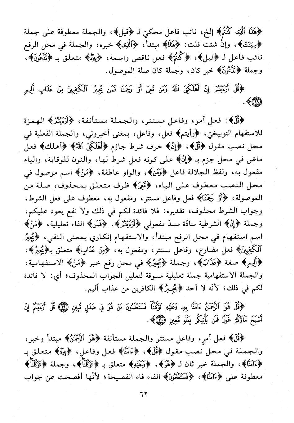 {قُلْ}: فعل أمر، وفاعل مستتر، والجملة مستأنفة، {أَرَأَيْتُمْ} الهمزة للاستفهام التوبيخيّ، {رأيتم} فعل، وفاعل، بمعنى أخبروني، والجملة الفعلية في محل نصب مقول {قُل}، {إنْ} حرف شرط جازم {أَهْلَكَنِيَ اللَّهُ} {أهلك} فعل ماض في محل جزم بـ {إنْ} على كونه فعل شرط لها، والنون للوقاية، والياء مفعول به، ولفظ الجلالة فاعل {وَمَن}، والواو عاطفة، {مَنْ} اسم موصول في محل النصب معطوف على الياء، {مَعِيَ} ظرف متعلق بمحذوف، صلة من الموصولة، {أَوْ رَحِمَنَا} فعل وفاعل مستتر، ومفعول به، معطوف على فعل الشرط، وجواب الشرط محذوف، تقديره: فلا فائدة لكم في ذلك ولا نفع يعود عليكم، وجملة {إنْ} الشرطية سادّة مسدّ مفعولي {أَرَأَيْتُمْ}. {فَمَن} الفاء تعليلية، {مَنْ} اسم استفهام في محل الرفع مبتدأ، والاستفهام إنكاري بمعنى النفي، {يُجِيرُ الْكَافِرِينَ} فعل مضارع، وفاعل مستتر، ومفعول به، {مِنْ عَذَابٍ} متعلق بـ {يُجِيرُ}، {أَلِيمٍ} صفة {عَذَابَ}، وجملة {يُجِيرُ} في محل رفع خبر {مَنْ} الاستفهامية، والجملة الاستفهامية جملة تعليلية مسوقة لتعليل الجواب المحذوف؛ أي: لا فائدة لكم في ذلك؛ لأنّه لا أحد {يُجِيرُ} الكافرين من عذاب أليم.