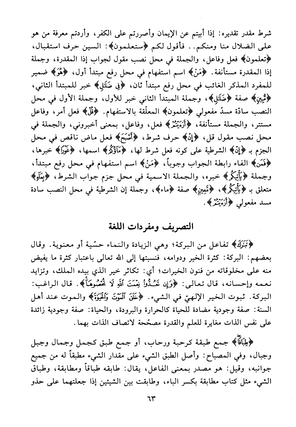 شرط مقدر تقديره: إذا أبيتم عن الإيمان وأصررتم على الكفر، وأردتم معرفة من هو على الضلال منا ومنكم .. فأقول لكم {ستعلمون}: السين حرف استقبال، {تعلمون} فعل وفاعل، والجملة في محل نصب مقول لجواب إذا المقدرة، وجملة إذا المقدرة مستأنفة. {مَنْ} اسم استفهام في محل رفع مبتدأ أول، {هُوَ} ضمير للمفرد المذكر الغائب في محل رفع مبتدأ ثان، {فِي ضَلَالٍ} خبر للمبتدأ الثاني، {مُبِينٍ} صفة {ضَلَالٍ}، وجملة المبتدأ الثاني خبر للأول، وجملة الأول في محل النصب سادّة مسدّ مفعولي {تعلمون} المعلّقة بالاستفهام. {قُلْ} فعل أمر، وفاعل مستتر، والجملة مستأنفة، {أَرَأَيْتُمْ} فعل، وفاعل، بمعنى أخبروني، والجملة في محل نصب مقول قل، {إن} حرف شرط، {أَصْبَحَ} فعل ماض ناقص في محل الجزم بـ {إنْ} الشرطية على كونه فعل شرط لها، {مَاؤُكُمْ} اسمها، {غَوْرًا} خبرها، {فَمَنْ} الفاء رابطة الجواب وجوبًا، {مَنْ} اسم استفهام في محل رفع مبتدأ، وجملة {يَأْتِيكُمْ} خبره، والجملة الاسمية في محل جزم جواب الشرط، {بِمَاءٍ} متعلق بـ {يَأْتِيكُمْ}، {مَعِينٍ} صفة {ماء}، وجملة إن الشرطية في محل النصب سادة مسد مفعولي {أَرَأَيْتُمْ}.