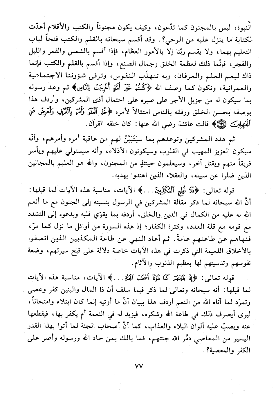 النبوة، ليس بالمجنون كما تدّعون، وكيف يكون مجنونًا والكتب والأقلام أعدّت لكتابة ما ينزل عليه من الوحي؟. وقد أقسم سبحانه بالقلم والكتب فتحًا لباب التعليم بهما، ولا يقسم ربّنا إلا بالأمور العظام، فإذا أقسم بالشمس والقمر والليل والفجر، فإنّما ذلك لعظمة الخلق وجمال الصنع، وإذا أقسم بالقلم والكتب فإنما ذاك ليعم العلم والعرفان، وبه تتهذّب النفوس، وترقى شؤوننا الاجتماءتية والعمرانية، ونكون كما وصف الله {كُنْتُمْ خَيْرَ أُمَّةٍ أُخْرِجَتْ لِلنَّاسِ} ثم وعد رسوله بما سيكون له من جزيل الأجر على صبره على احتمال أذى المشركين، وأردف هذا بوصفه بحسن الخلق ورفقه بالناس امتثالًا لأمره {خُذِ الْعَفْوَ وَأْمُرْ بِالْعُرْفِ وَأَعْرِضْ عَنِ الْجَاهِلِينَ (199)} قالت عائشة رضي الله عنها: كان خلقه القرآن.