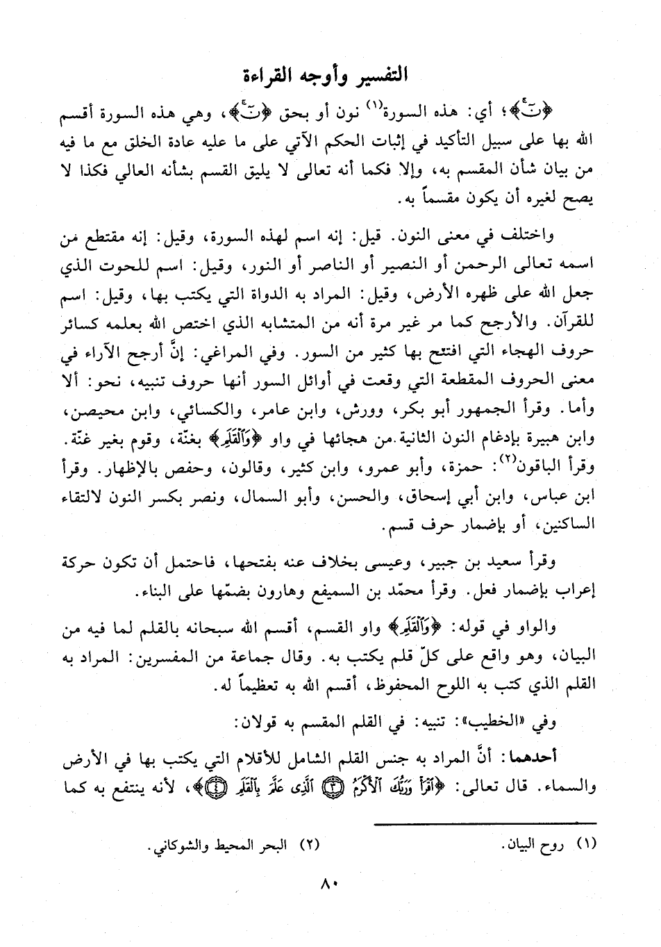 واختلف في معنى النون. قيل: إنه اسم لهذه السورة، وقيل: إنه مقتطع فن اسمه تعالى الرحمن أو النصير أو الناصر أو النور، وقيل: اسم للحوت الذي جعل الله على ظهره الأرض، وقيل: المراد به الدواة التي يكتب بها، وقيل: اسم للقرآن. والأرجح كما مر غير مرة أنه من المتشابه الذي اختص الله بعلمه كسائر حروف الهجاء التي افتتح بها كثير من السور. وفي المراغي: إنَّ أرجح الآراء في معنى الحروف المقطعة التي وقعت في أوائل السور أنها حروف تنبيه، نحو: ألا وأما. وقرأ الجمهور أبو بكر، وورش، وابن عامر، والكسائي، وابن محيصن، وابن هبيرة بإدغام النون الثانية. من هجائها في واو {وَالْقَلَمِ} بغنّة، وقوم بغير غنّة. وقرأ الباقون (¬2): حمزة، وأبو عمرو، وابن كثير، وقالون، وحفص بالإظهار. وقرأ ابن عباس، وابن أبي إسحاق، والحسن، وأبو السمال، ونصر بكسر النون لالتقاء الساكنين، أو بإضمار حرف قسم.