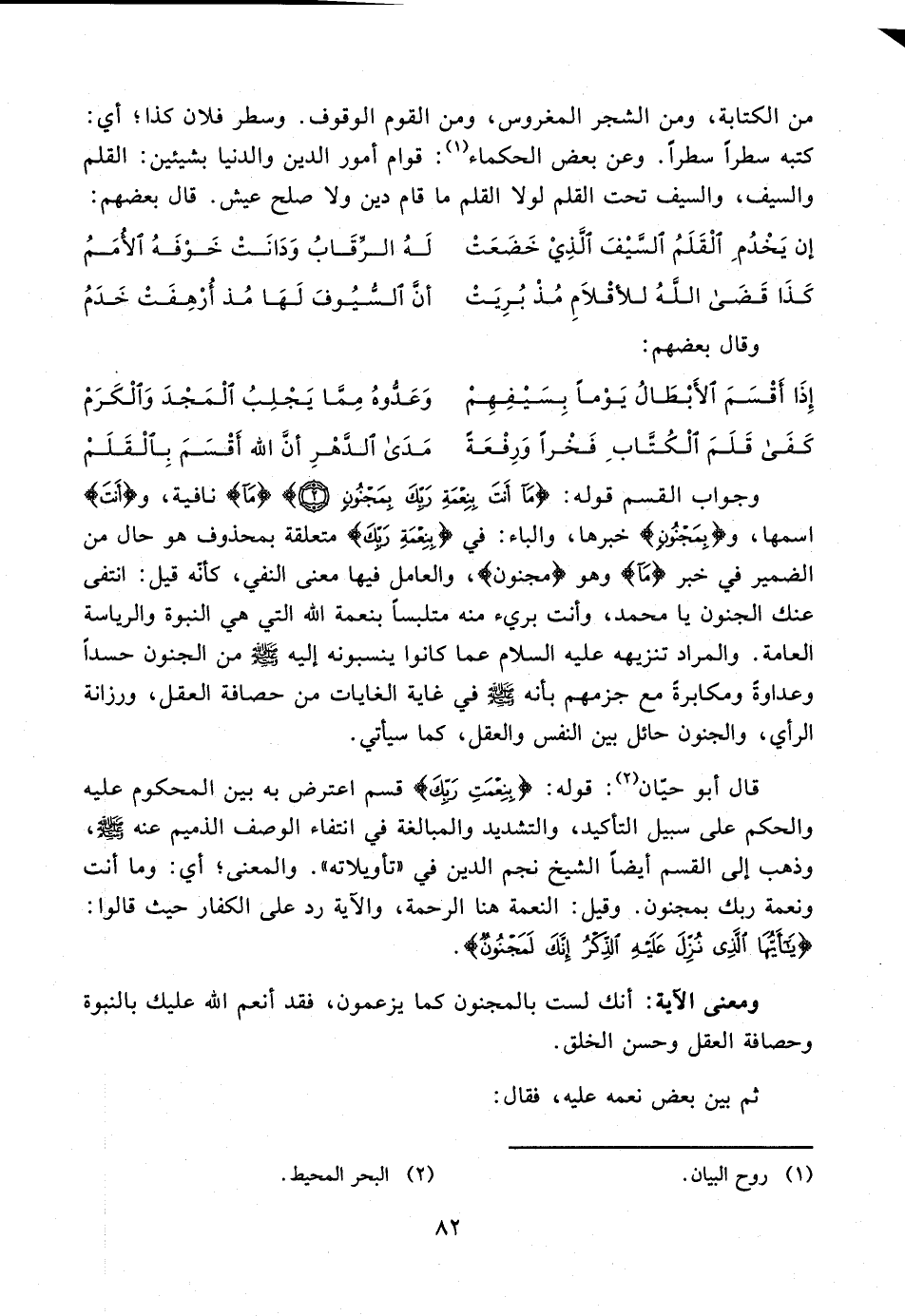2 - وجواب القسم قوله: {مَا أَنْتَ بِنِعْمَةِ رَبِّكَ بِمَجْنُونٍ (2)} {مَا} نافية، و {أَنْتَ} اسمها، و {بِمَجْنُونٍ} خبرها، والباء: في {بِنِعْمَةِ رَبِّكَ} متعلقة بمحذوف هو حال من الضمير في خبر {مَا} وهو {مجنون}، والعامل فيها معنى النفي، كأنّه قيل: انتفى عنك الجنون يا محمد، وأنت بريء منه متلبسًا بنعمة الله التي هي النبوة والرياسة العامة. والمراد تنزيهه عليه السلام عما كانوا ينسبونه إليه - صلى الله عليه وسلم - من الجنون حسدًا وعداوةً ومكابرةً مع جزمهم بأنه - صلى الله عليه وسلم - في غاية الغايات من حصافة العقل، ورزانة الرأي، والجنون حائل بين النفس والعقل، كما سيأتي.