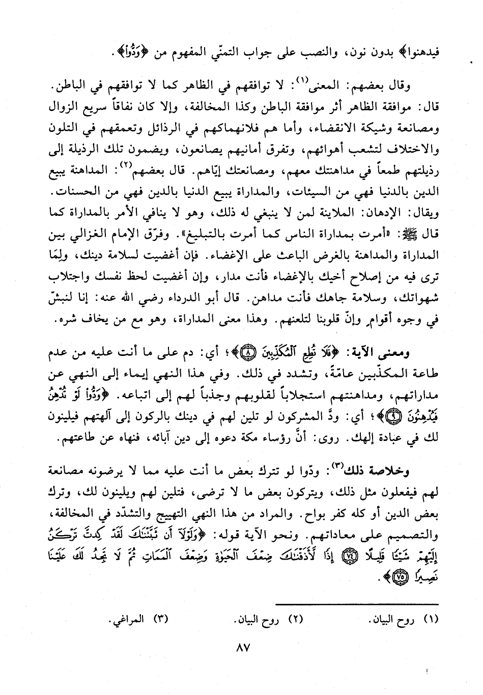 وقال بعضهم: المعنى (¬1): لا توافقهم في الظاهر كما لا توافقهم في الباطن. قال: موافقة الظاهر أثر موافقة الباطن وكذا المخالفة، وإلا كان نفاقًا سريع الزوال ومصانعة وشيكة الانقضاء، وأما هم فلانهماكهم في الرذائل وتعمقهم في التلون والاختلاف لتشعب أهوائهم، وتفرق أمانيهم يصانعون، ويضمون تلك الرذيلة إلى رذيلتهم طمعًا في مداهنتك معهم، ومصانعتك إيّاهم. قال بعضهم (¬2): المداهنة يبيع الدين بالدنيا فهي من السيئات، والمداراة يبيع الدنيا بالدين فهي من الحسنات. ويقال: الإدهان: الملاينة لمن لا ينبغي له ذلك، وهو لا ينافي الأمر بالمداراة كما قال - صلى الله عليه وسلم -: "أمرت بمداراة الناس كما أمرت بالتبليغ". وفرّق الإمام الغزالي بين المداراة والمداهنة بالغرض الباعث على الإغضاء. فإن أغضيت لسلامة دينك، ولِمَا ترى فيه من إصلاح أخيك بالإغضاء فأنت مدار، وإن أغضيت لحظ نفسك واجتلاب شهواتك، وسلامة جاهك فأنت مداهن. قال أبو الدرداء رضي الله عنه: إنا لنبشّ في وجوه أقوامٍ وإنّ قلوبنا لتلعنهم. وهذا معنى المداراة، وهو مع من يخاف شره.