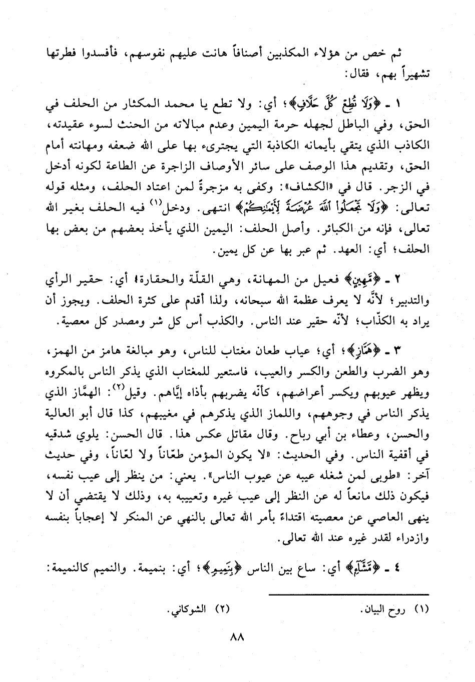 2 - {مَّهِينٍ} فعيل من المهانة، وهي القلّة والحقارة أي: حقير الرأي والتدبير؛ لأنَّه لا يعرف عظمة الله سبحانه، ولذا أقدم على كثرة الحلف. ويجوز أن يراد به الكذّاب؛ لأنّه حقير عند الناس. والكذب أس كل شر ومصدر كل معصية.