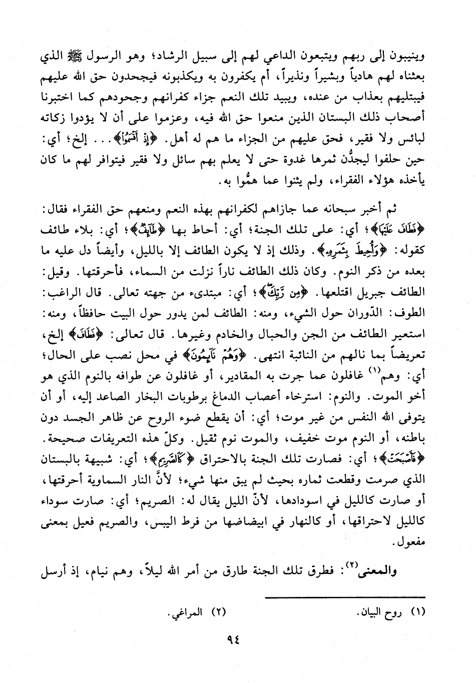 19 - ثم أخبر سبحانه عما جازاهم لكفرانهم بهذه النعم ومنعهم حق الفقراء فقال: {فَطَافَ عَلَيْهَا}؛ أي: على تلك الجنة؛ أي: أحاط بها {طَائِفٌ}؛ أي: بلاء طائف كقوله: {وَأُحِيطَ بِثَمَرِهِ}. وذلك إذ لا يكون الطائف إلا بالليل، وأيضًا دل عليه ما بعده من ذكر النوم. وكان ذلك الطائف نارًا نزلت من السماء، فأحرقتها. وقيل: الطائف جبريل اقتلعها. {مِنْ رَبِّكَ}؛ أي: مبتدىء من جهته تعالى. قال الراغب: الطوف: الدّوران حول الشيء، ومنه: الطائف لمن يدور حول البيت حافظًا، ومنه: استعير الطائف من الجن والحبال والخادم وغيرها. قال تعالى: {فَطَافَ} إلخ، تعريضًا بما نالهم من النائبة انتهى. {وَهُمْ نَائِمُونَ} في محل نصب على الحال؛ أي: وهم (¬1) غافلون عما جرت به المقادير، أو غافلون عن طوافه بالنوم الذي هو أخو الموت. والنوم: استرخاء أعصاب الدماغ برطوبات البخار الصاعد إليه، أو أن يتوفى الله النفس من غير موت؛ أي: أن يقطع ضوء الروح عن ظاهر الجسد دون باطنه، أو النوم موت خفيف، والموت نوم ثقيل. وكلّ هذه التعريفات صحيحة.