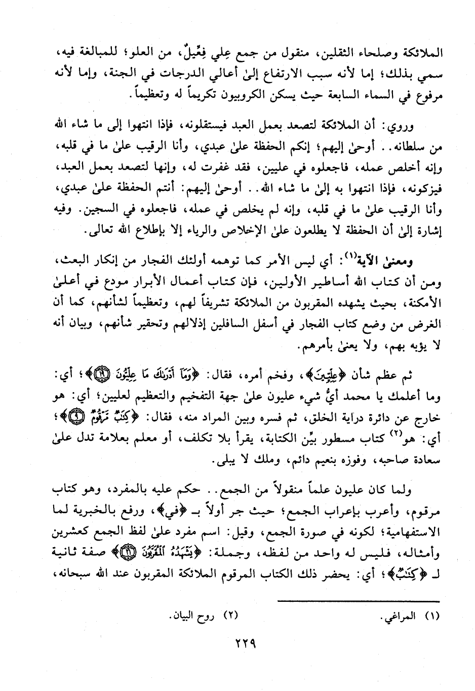 ولما كان عليون علمًا منقولًا من الجمع .. حكم عليه بالمفرد، وهو كتاب مرقوم، وأعرب بإعراب الجمع؛ حيث جر أولًا بـ {في}، ورفع بالخبرية لما الاستفهامية؛ لكونه في صورة الجمع، وقيل: اسم مفرد على لفظ الجع كعشرين وأمثاله، فليس له واحد من لفظه،