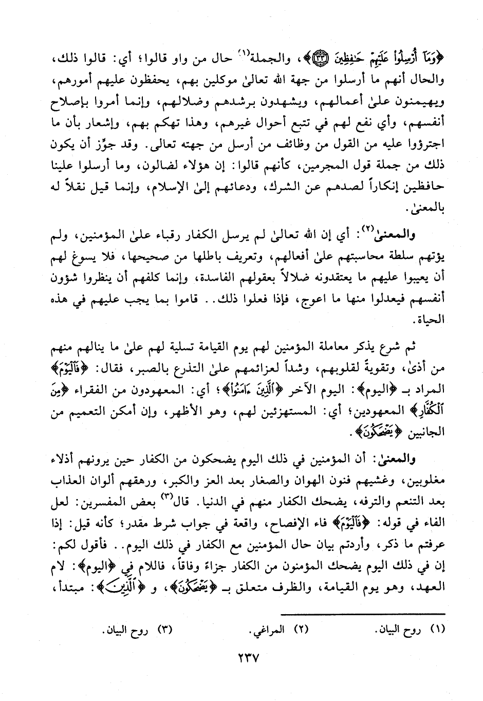 {وَمَا أُرْسِلُوا عَلَيْهِمْ حَافِظِينَ (33)}، والجملة (¬1) حال من واو قالوا؛ أي: قالوا ذلك، والحال أنهم ما أرسلوا من جهة الله تعالى موكلين بهم، يحفظون عليهم أمورهم، ويهيمنون على أعمالهم، ويشهدون برشدهم وضلالهم، وإنما أمروا بإصلاح أنفسهم، وأي نفع لهم في تتبع أحوال غيرهم، وهذا تهكم بهم، وإشعار بأن ما اجترؤوا عليه من القول من وظائف من أرسل من جهته تعالى. وقد جوِّز أن يكون ذلك من جملة قول المجرمين، كأنهم قالوا: إن هؤلاء لضالون، وما أرسلوا علينا حافظين إنكارًا لصدهم عن الشرك، ودعائهم إلى الإسلام، وإنما قيل نقلًا له بالمعنى.