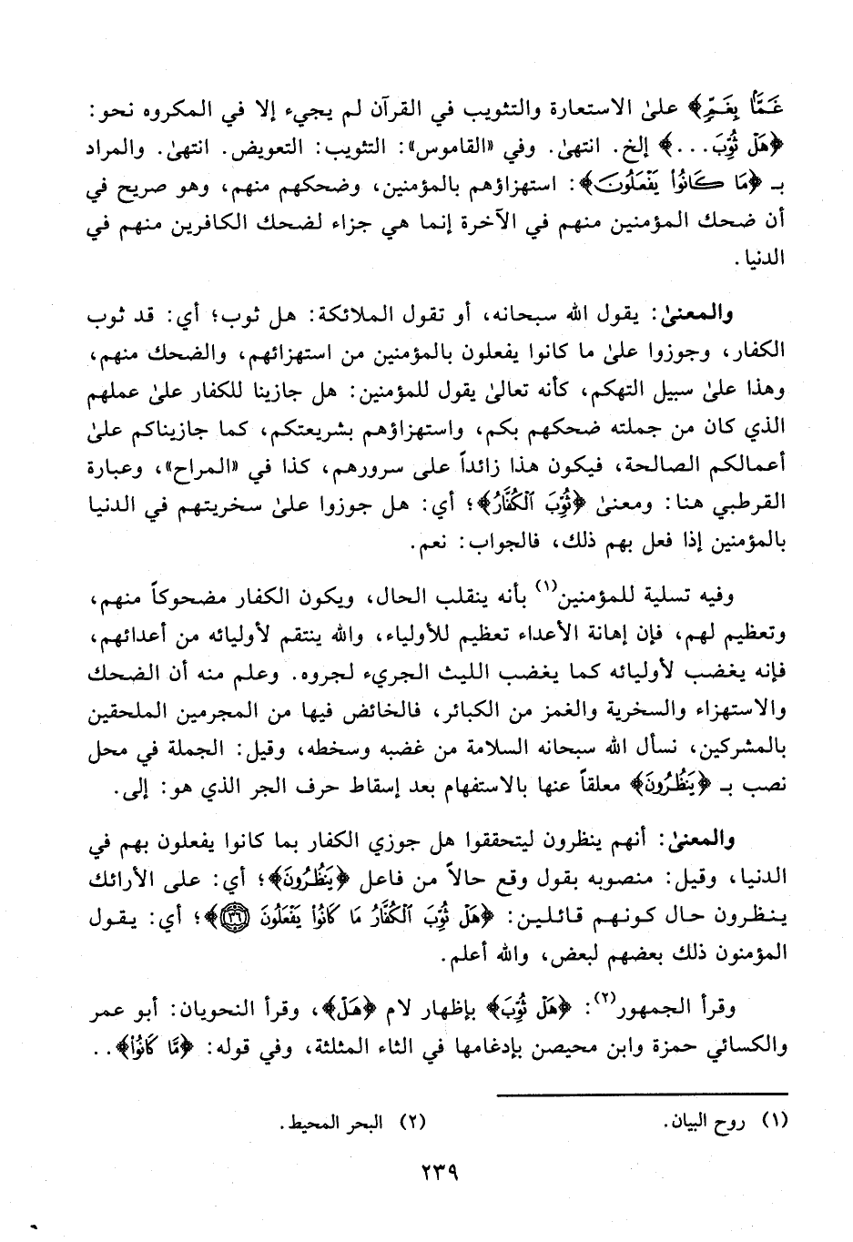 وقرأ الجمهور (¬2): {هَلْ ثُوِّبَ} بإظهار لام {هَلْ}، وقرأ النحويان: أبو عمر والكسائي حمزة وابن محيصن بإدغامها في الثاء المثلثة، وفي قوله: {مَا كَانُوا} ..