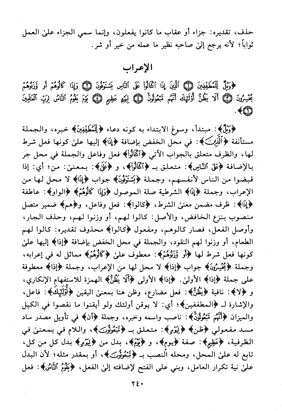 {وَيْلٌ لِلْمُطَفِّفِينَ (1) الَّذِينَ إِذَا اكْتَالُوا عَلَى النَّاسِ يَسْتَوْفُونَ (2) وَإِذَا كَالُوهُمْ أَوْ وَزَنُوهُمْ يُخْسِرُونَ (3) أَلَا يَظُنُّ أُولَئِكَ أَنَّهُمْ مَبْعُوثُونَ (4) لِيَوْمٍ عَظِيمٍ (5) يَوْمَ يَقُومُ النَّاسُ لِرَبِّ الْعَالَمِينَ (6)}.