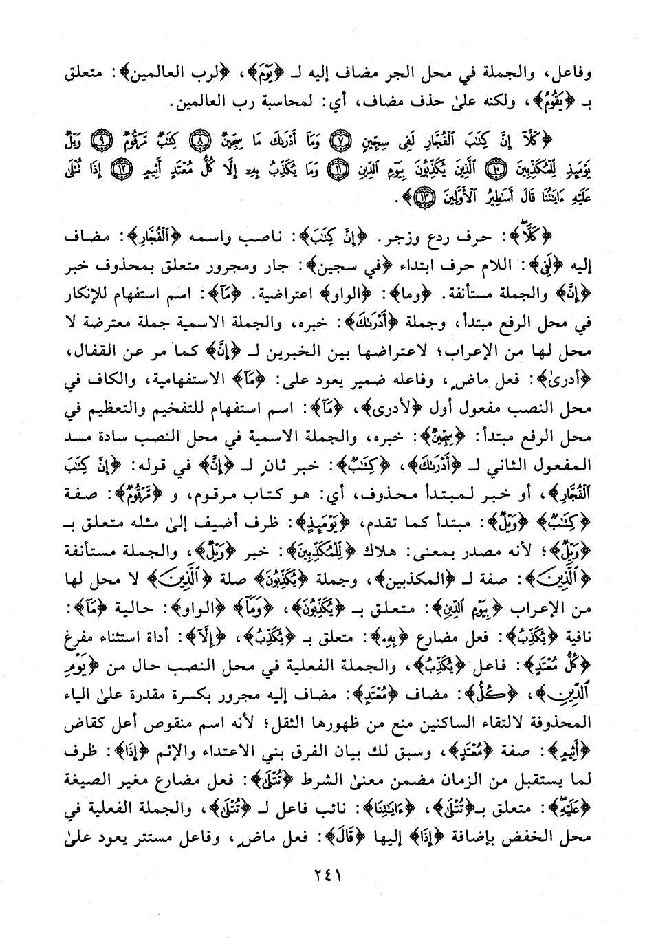 {كَلَّا}: حرف ردع وزجر. {إِنَّ كِتَابَ}: ناصب واسمه {الْفُجَّارِ}: مضاف إليه {لَفِي}: اللام حرف ابتداء {في سجين}: جار ومجرور متعلق بمحذوف خبر {إِنَّ} والجملة مستأنفة. {وما}: {الواو} اعتراضية. {مَا}: اسم استفهام للإنكار في محل الرفع مبتدأ، وجملة {أَدْرَاكَ}: خبره، والجملة الاسمية جملة معترضة لا محل لها من الإعراب؛ لاعتراضها بين الخبرين لـ {إنَّ} كما مر عن القفال، {أدرى} فعل ماضٍ، وفاعله ضمير يعود على: {مَا} الاستفهامية، والكاف في محل النصب مفعول أول {لأدرى}، {مَا}: اسم استفهام للتفخيم والتعظيم في محل الرفع مبتدأ: {سِجِّينٌ}: خبره، والجملة الاسمية في محل النصب سادة مسد المفعول الثاني لـ {أَدْرَاكَ}، {كِتَابٌ}: خبر ثانٍ لـ {إنَّ} في قوله: {إِنَّ كِتَابَ الْفُجَّار}، أو خبر لمبتدأ محذوف، أي: هو كتاب مرقوم، و {مَرْقُومٌ}: صفة {كِتَابٌ} {وَيْلٌ}: مبتدأ كما تقدم، {يَوْمَئِذٍ}: ظرف أضيف إلى مثله متعلق بـ {وَيْلٌ}؛ لأنه مصدر بمعنى: هلاك {لِلْمُكَذِّبِينَ}: خبر {وَيْلٌ}، والجملة مستأنفة {الَّذِينَ}: صفة لـ {المكذبين}، وجملة {يُكَذِّبُونَ} صلة {الَّذِينَ} لا محل لها من الإعراب {بِيَوْمِ الدِّينِ}: متعلق بـ {يُكَذِّبُونَ}، {وَمَا} {الواو}: حالية {مَا}: نافية {يُكَذِّبُ}: فعل مضارع {بِهِ}: متعلق بـ {يُكَذِّبُ}، {إِلَّا}: أداة استثناء مفرغ {كُلُّ مُعْتَدٍ}: فاعل {يُكَذِّبُ}، والجملة الفعلية في محل النصب حال من {يَوْمِ الدِّينِ}، {كُلُّ}: مضاف {مُعْتَدٍ}: مضاف إليه مجرور بكسرة مقدرة على الياء المحذوفة لالتقاء الساكنين منع من ظهورها الثقل؛ لأنه اسم منقوص أعل كقاض {أَثِيمٍ}: صفة {مُعْتَدٍ}، وسبق لك بيان الفرق بين الاعتداء والإثم {إذا}: ظرف لما يستقبل من الزمان مضمن معنى الشرط {تُتْلَى}: فعل مضارع مغير الصيغة {عَلَيْهِ}: متعلق بـ {تُتْلَى}، {آيَاتُنَا}: نائب فاعل لـ {تُتْلَى}، والجملة الفعلية في محل الخفض بإضافة {إذا} إليها {قَالَ}: فعل ماضٍ، وفاعل مستتر يعود على